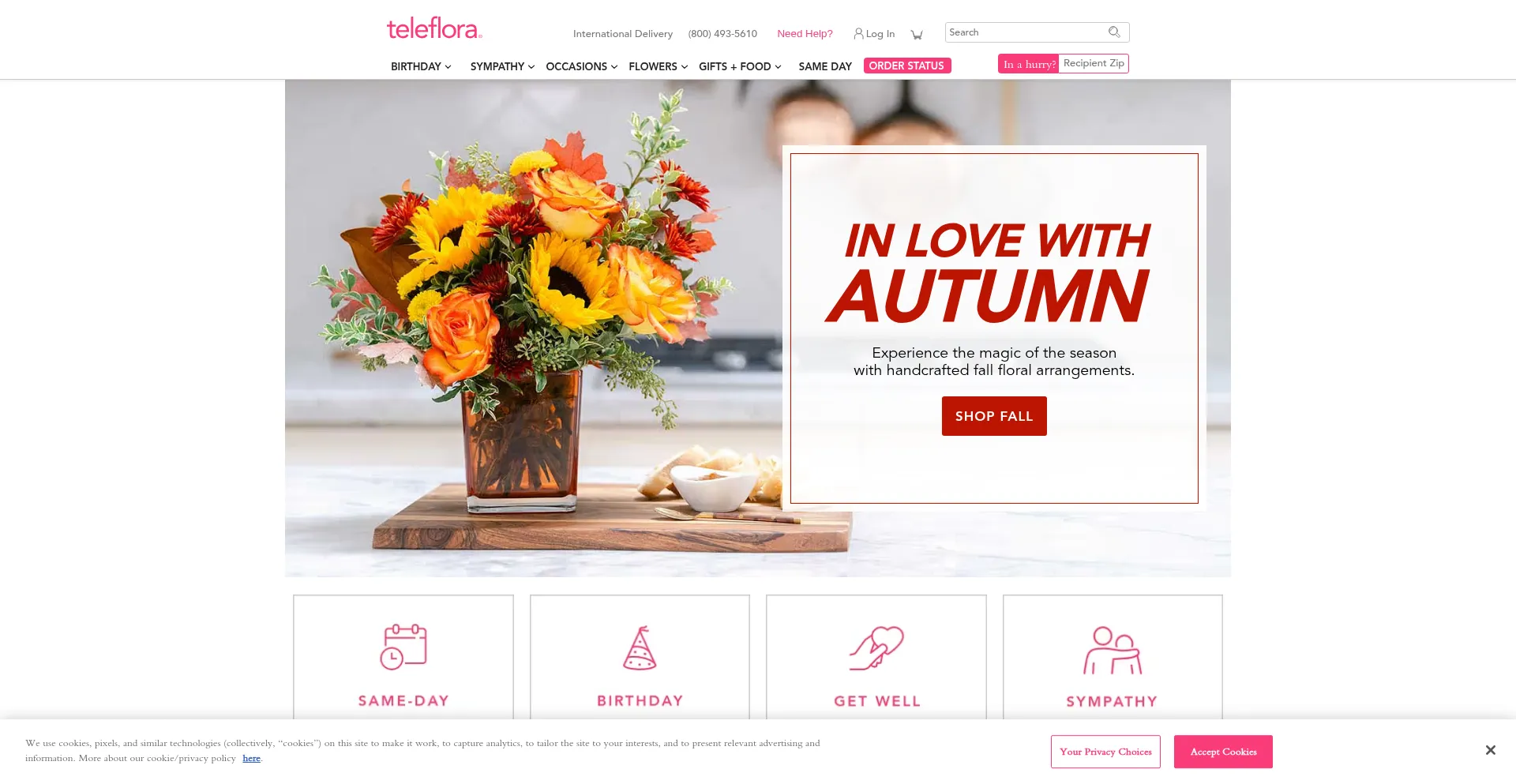 该网站实现符合GDPR或CCPA等隐私法规的cookie同意机制。这表明 teleflora.com 遵守数据保护标准并为用户提供对个人数据收集实践的控制。
