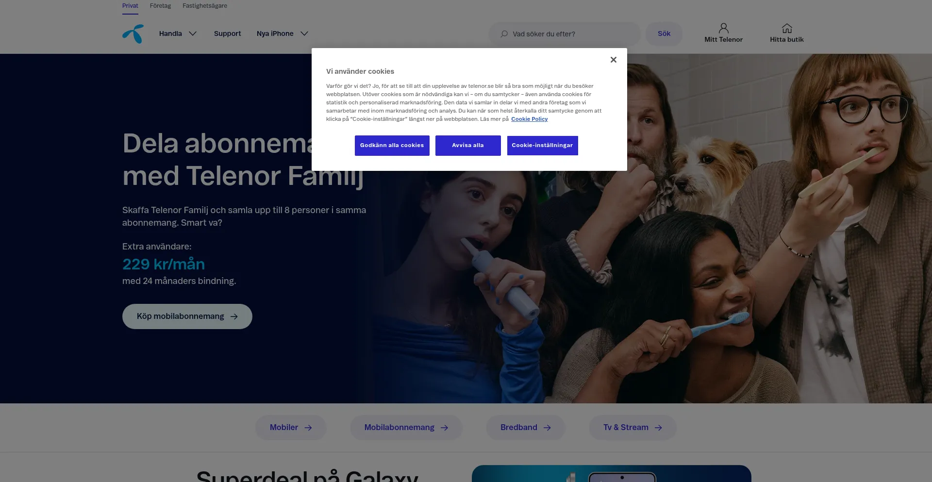 该网站实现符合GDPR或CCPA等隐私法规的cookie同意机制。这表明 telenor.se 遵守数据保护标准并为用户提供对个人数据收集实践的控制。