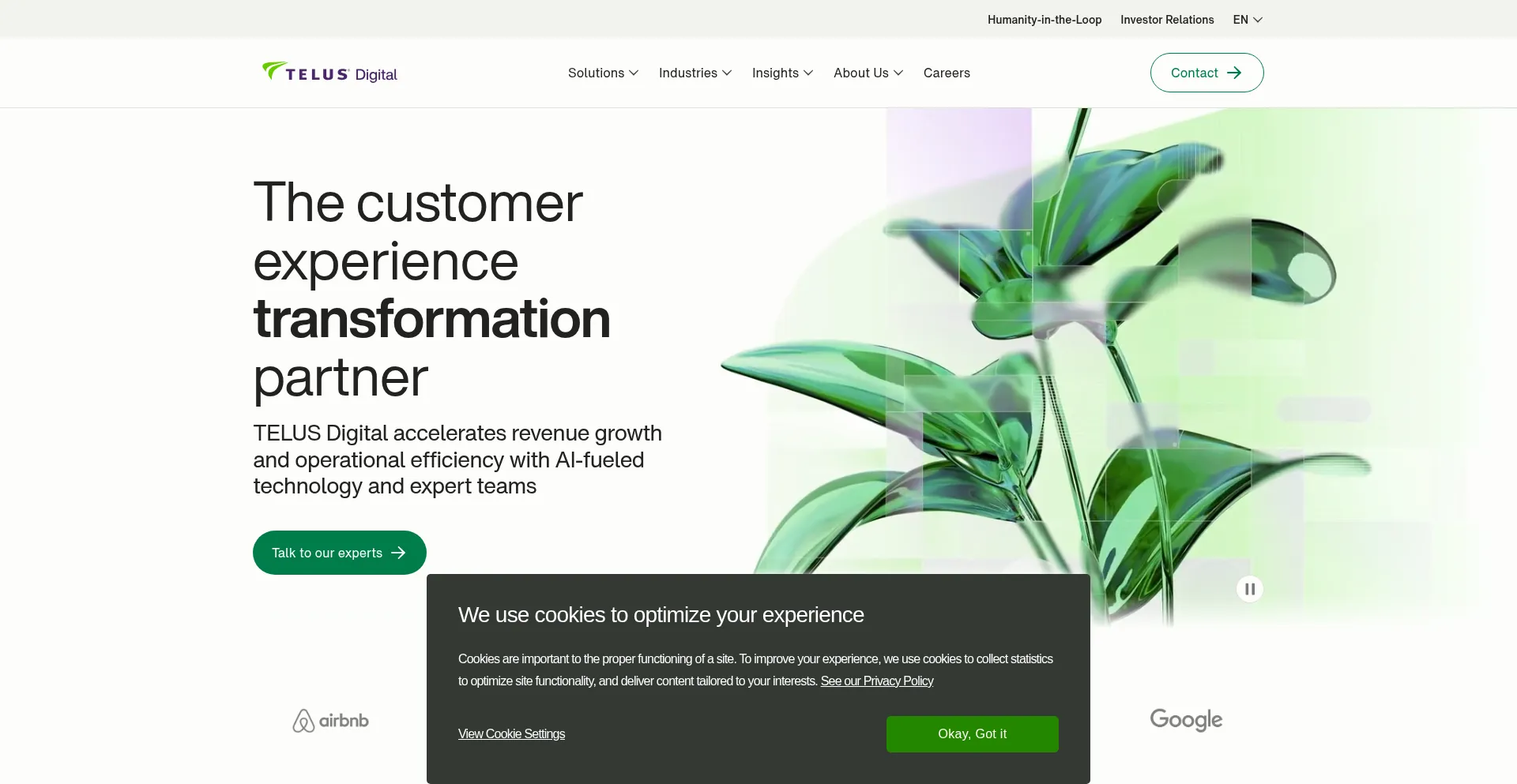 该网站实现符合GDPR或CCPA等隐私法规的cookie同意机制。这表明 telusdigital.com 遵守数据保护标准并为用户提供对个人数据收集实践的控制。