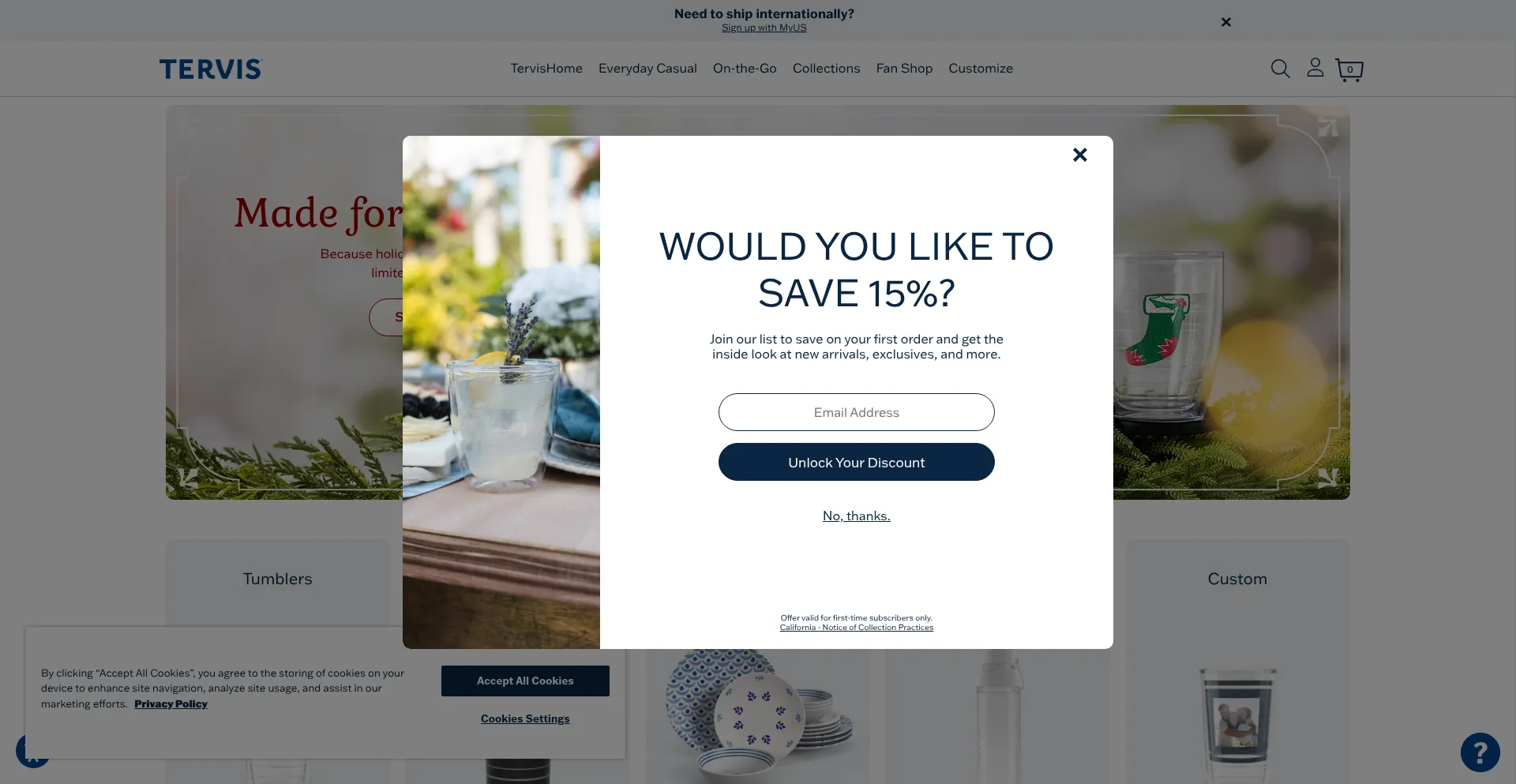该网站实现符合GDPR或CCPA等隐私法规的cookie同意机制。这表明 tervis.com 遵守数据保护标准并为用户提供对个人数据收集实践的控制。