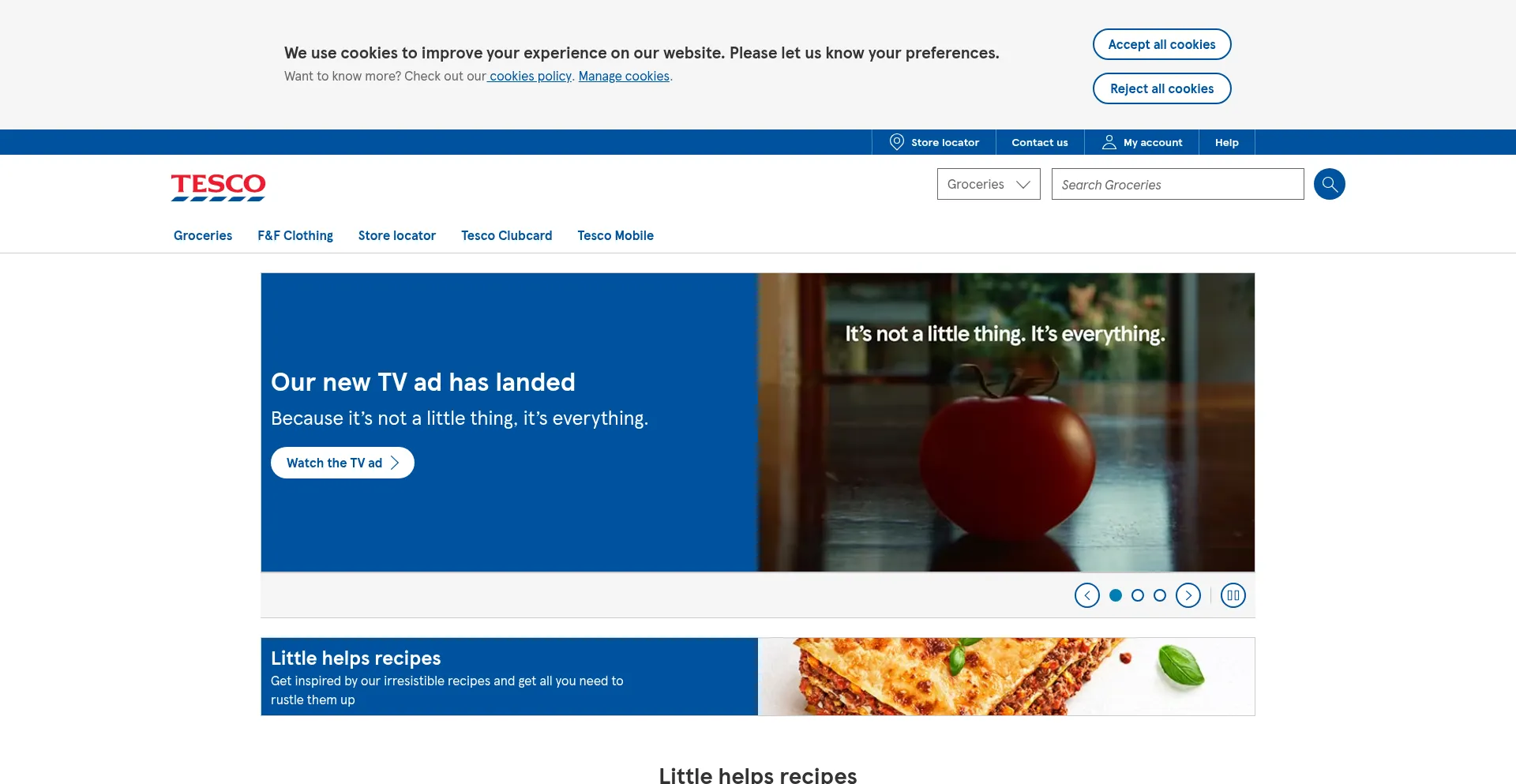 该网站实现符合GDPR或CCPA等隐私法规的cookie同意机制。这表明 tesco.ie 遵守数据保护标准并为用户提供对个人数据收集实践的控制。