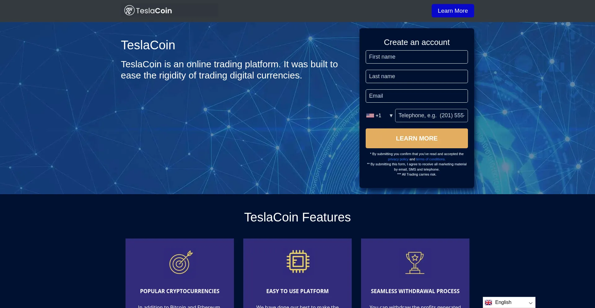 该网站实现数据收集表单,请求个人信息,包括姓名、电子邮件地址、电话号码或其他敏感详细信息。用户应验证 tesla-coin.io 的合法性并在提交个人数据前查看隐私政策。