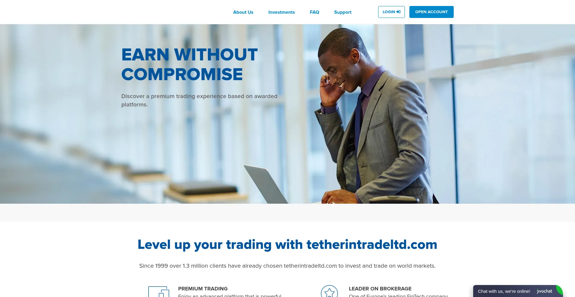 该网站实现数据收集表单,请求个人信息,包括姓名、电子邮件地址、电话号码或其他敏感详细信息。用户应验证 tetherintradeltd.com 的合法性并在提交个人数据前查看隐私政策。