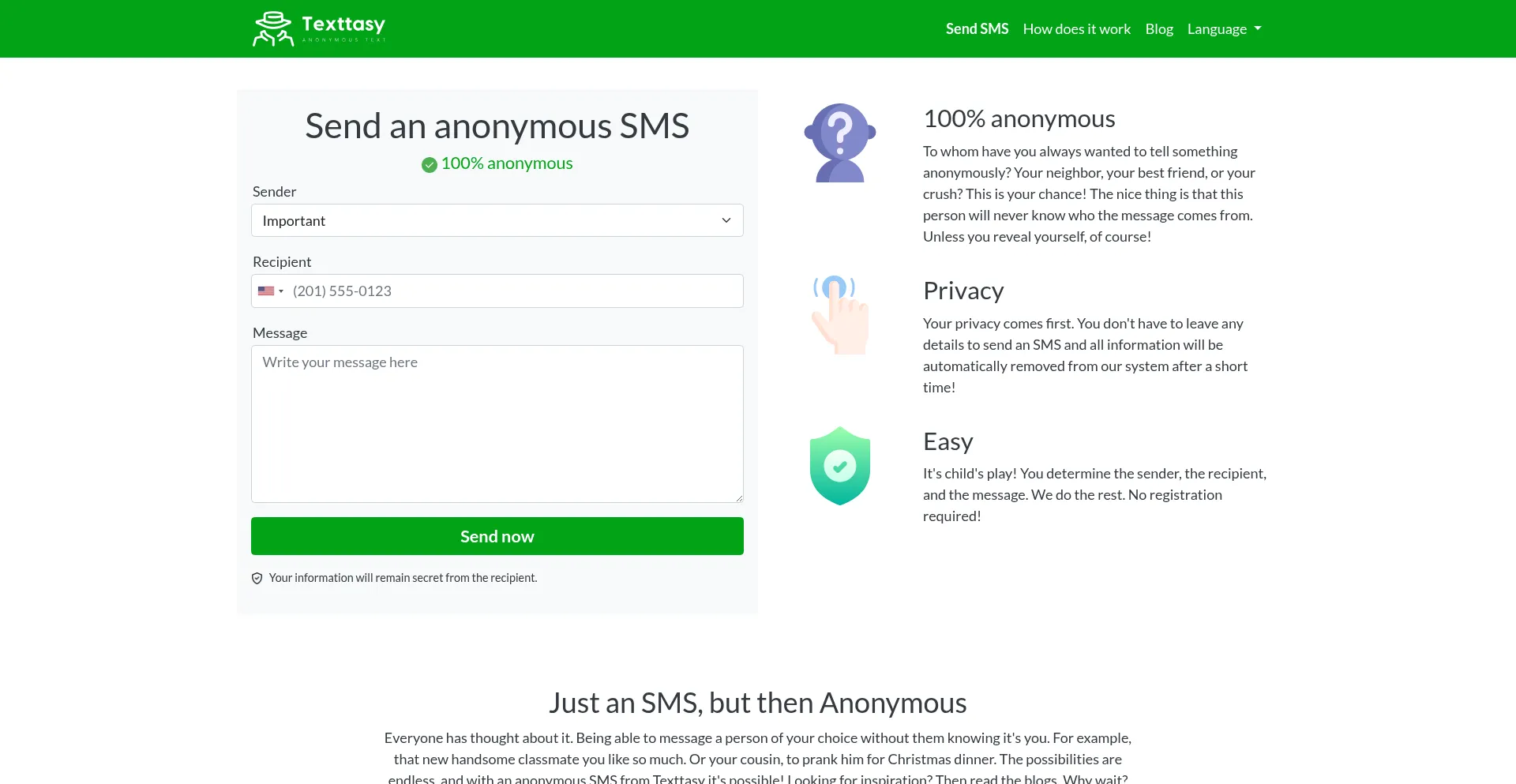Send an anonymous SMS | Texttasy