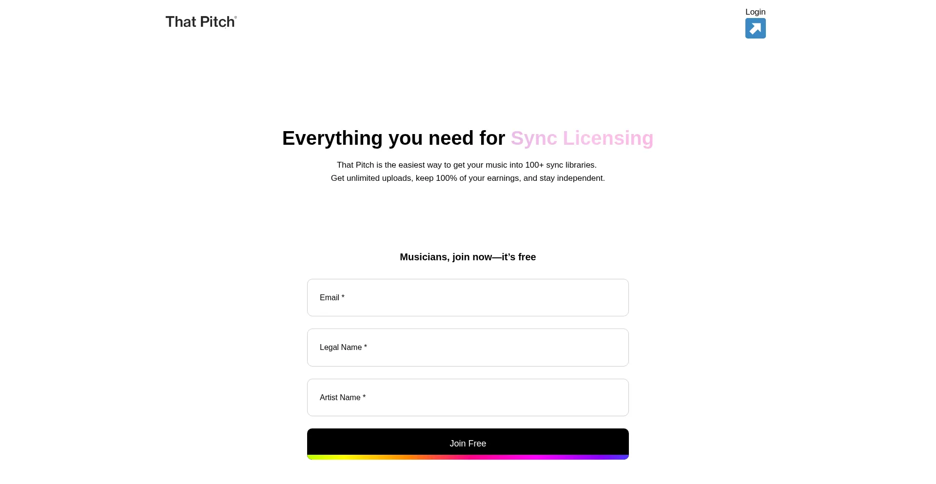 That Pitch is the easiest way to get your music into 100+ sync libraries. Get unlimited uploads, keep 100% of your earnings, and stay independent.