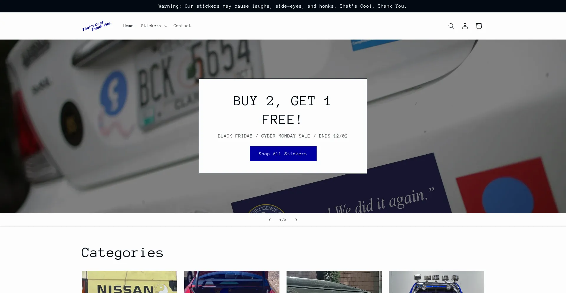 That’s Cool Thank You makes America’s best bumper stickers — bold, funny, and unapologetic. Printed on premium adhesive vinyl, our stickers stick hard, last long, and say ...