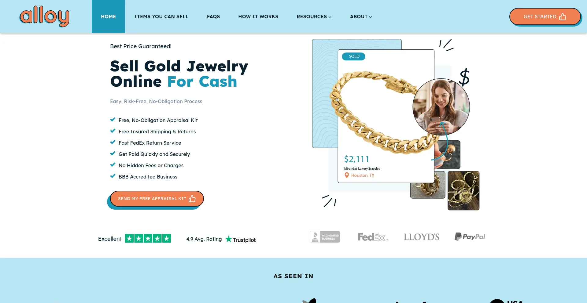 Sell your gold securely online for cash. Get free estimates and free insured shipping. Highest payouts guaranteed. Turn your gold into cash with Alloy today!"