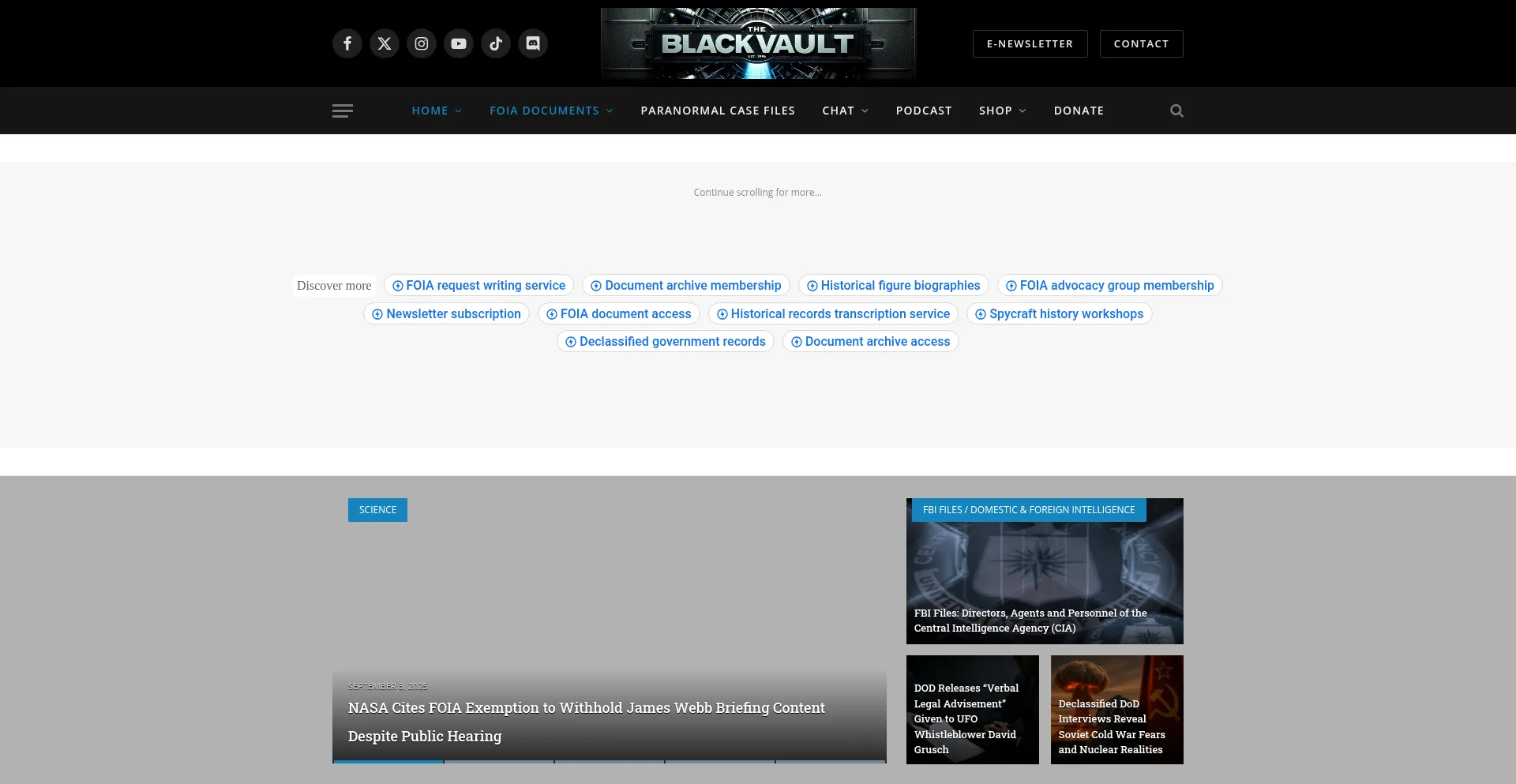 网站上存在社交媒体链接表明 theblackvault.com 在社交媒体上维护官方账户,这是可信度和参与度的积极信号。