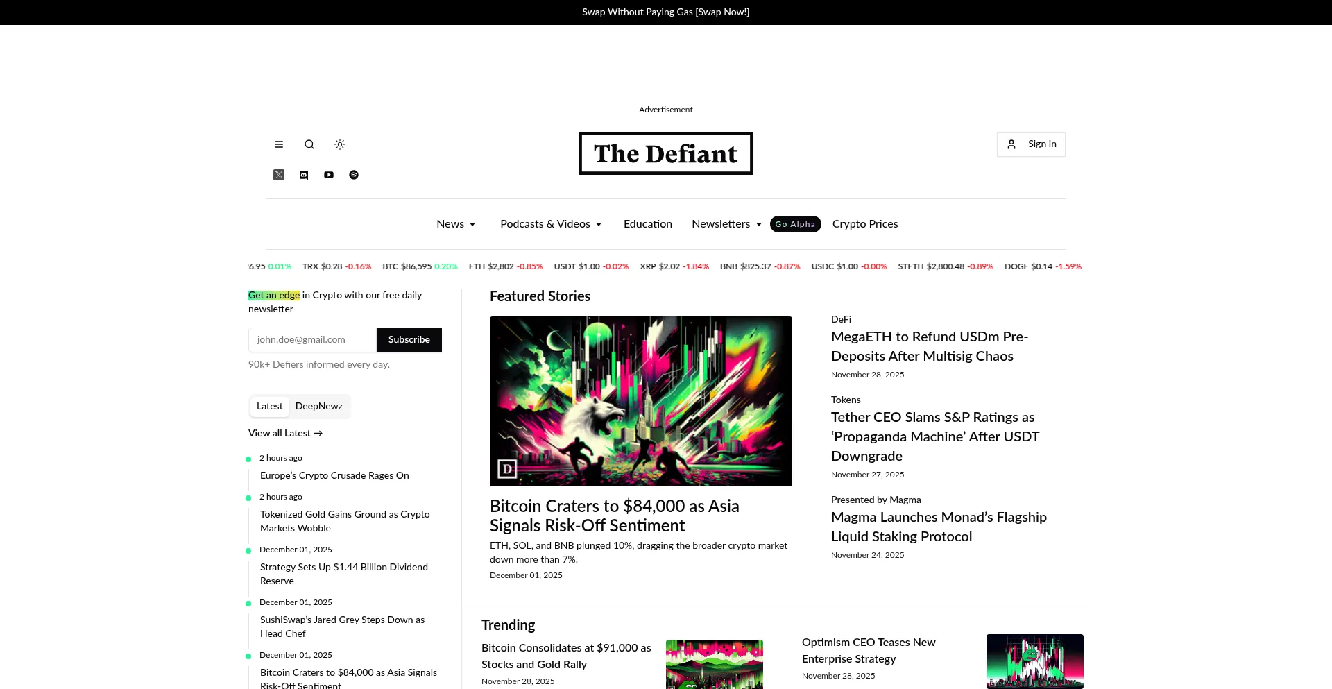网站上存在社交媒体链接表明 thedefiant.io 在社交媒体上维护官方账户,这是可信度和参与度的积极信号。