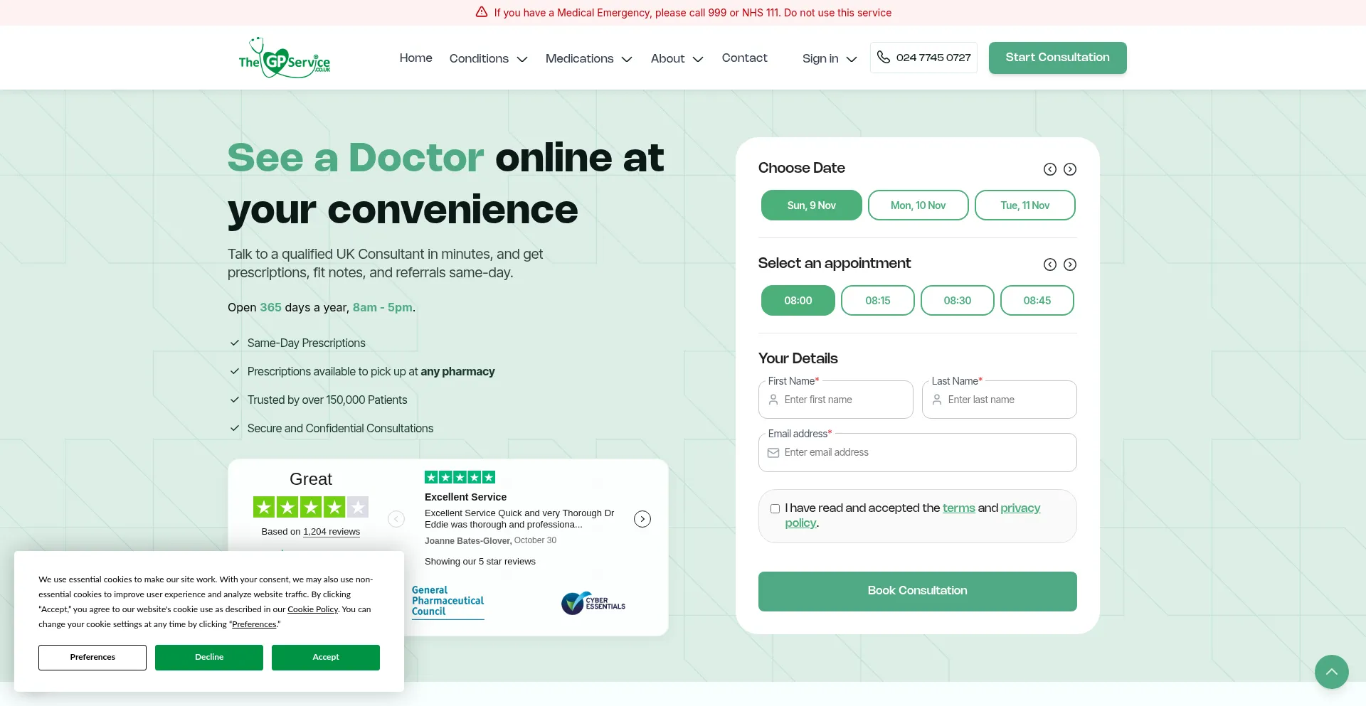 该网站实现符合GDPR或CCPA等隐私法规的cookie同意机制。这表明 thegpservice.co.uk 遵守数据保护标准并为用户提供对个人数据收集实践的控制。
