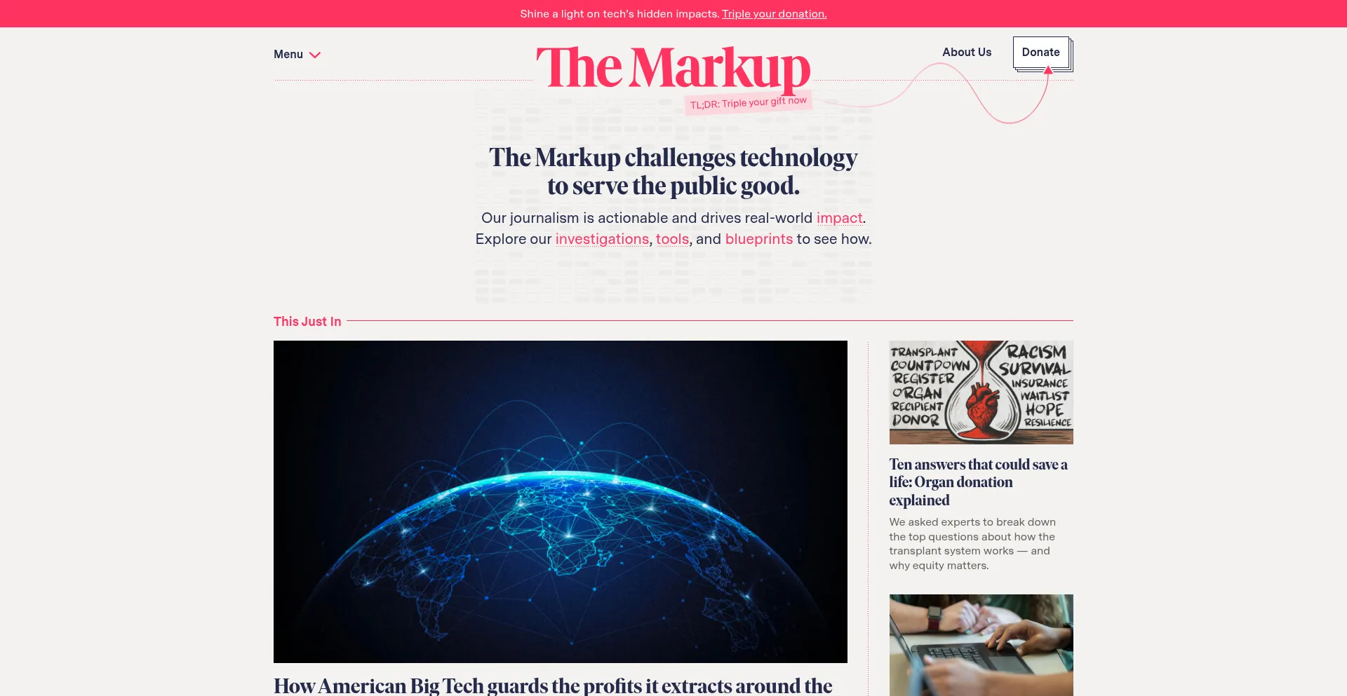 网站上存在社交媒体链接表明 themarkup.org 在社交媒体上维护官方账户,这是可信度和参与度的积极信号。