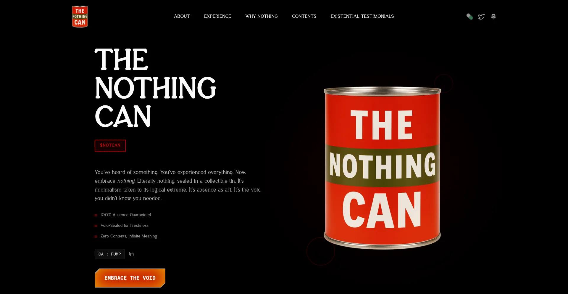 Literally nothing. In a can. The ultimate statement piece for those who appreciate the void. Own the absence of everything.