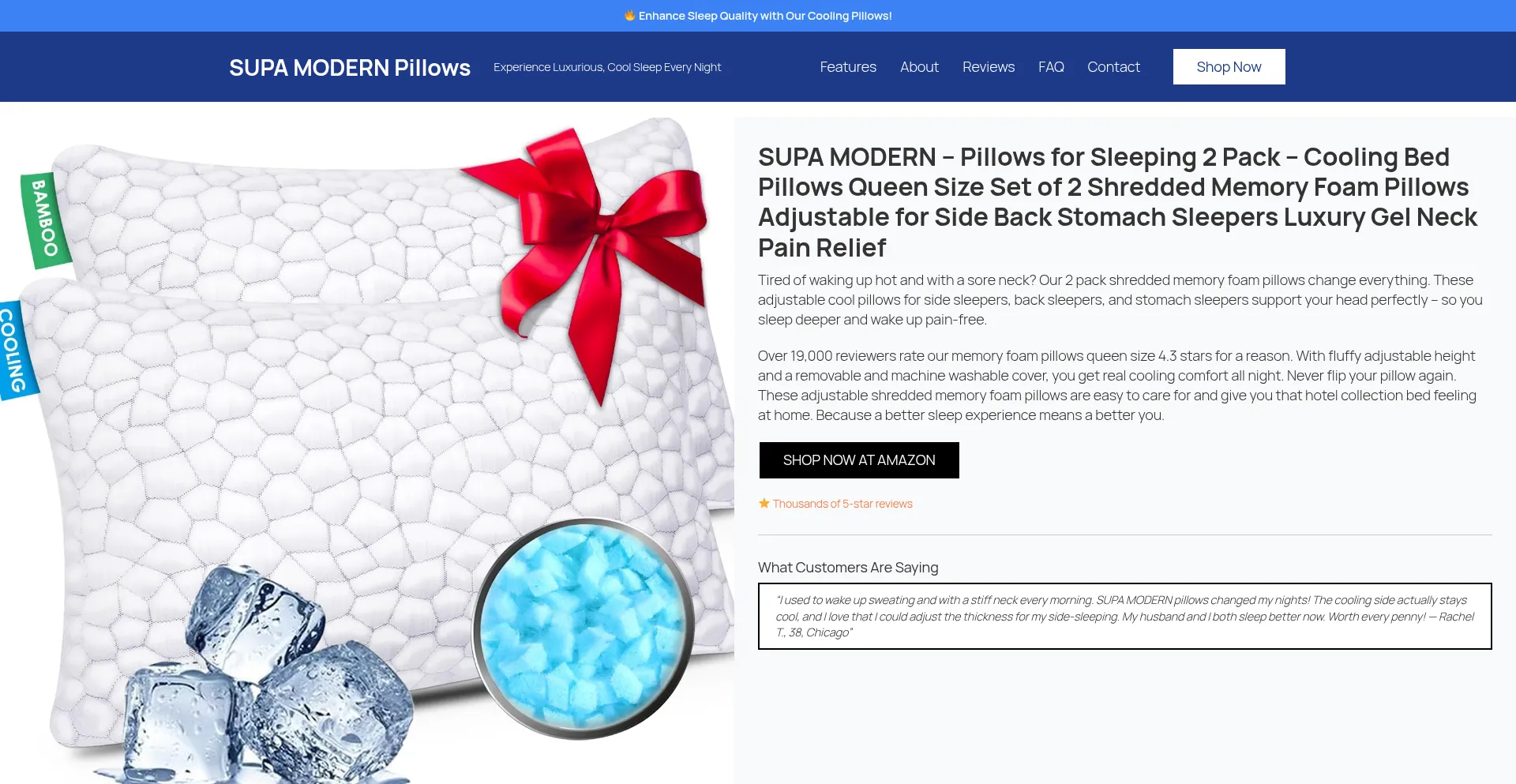SUPA MODERN Cooling Bed Pillows for Sleeping: Enjoy cool comfort. Adjustable shredded memory foam pillows, perfect for side, back, and stomach sleepers.