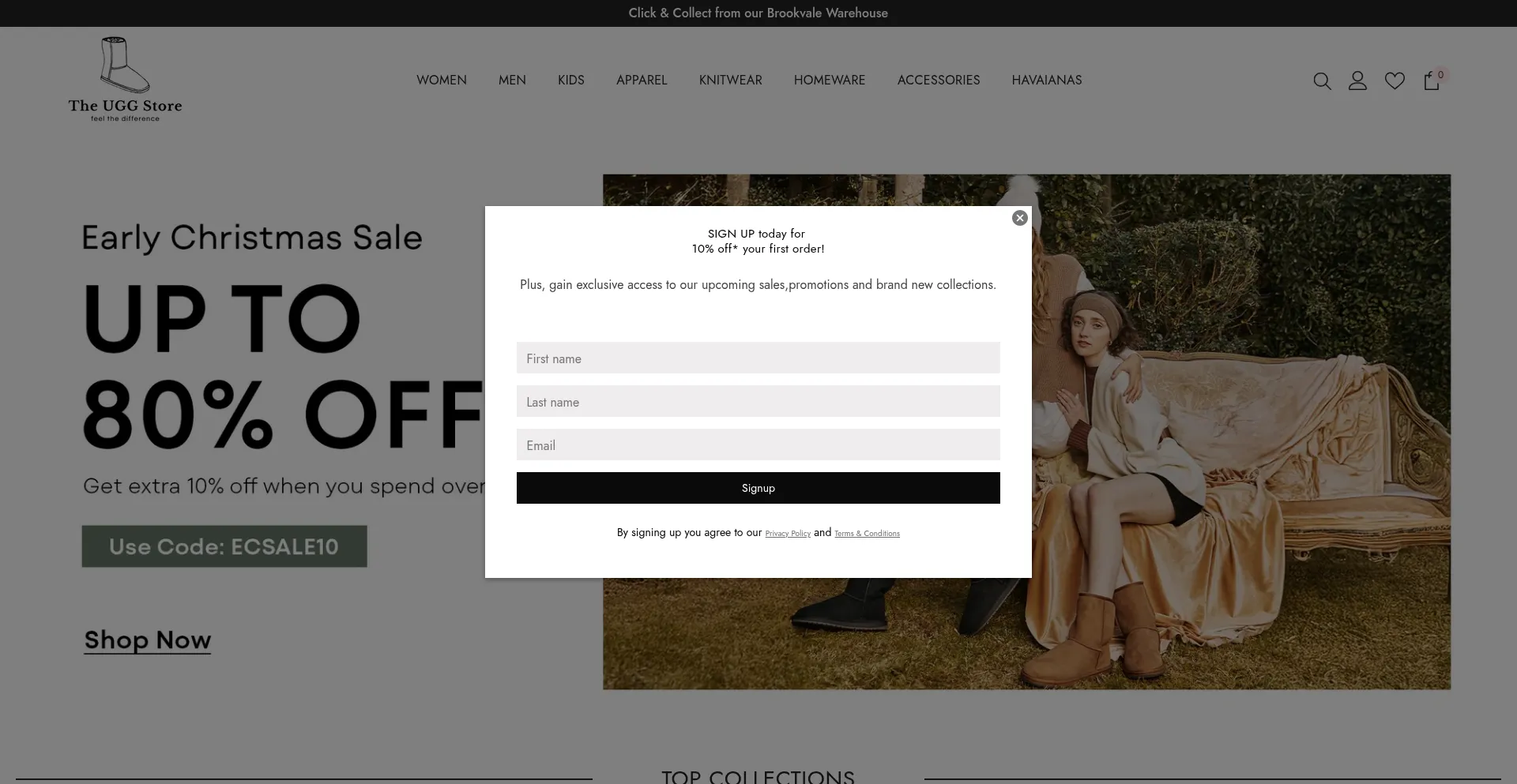 该网站实现数据收集表单,请求个人信息,包括姓名、电子邮件地址、电话号码或其他敏感详细信息。用户应验证 theuggstore.com.au 的合法性并在提交个人数据前查看隐私政策。