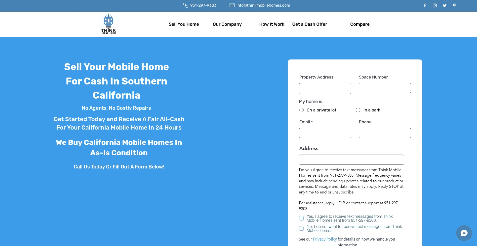 网站上存在社交媒体链接表明 thinkmobilehomes.com 在社交媒体上维护官方账户,这是可信度和参与度的积极信号。