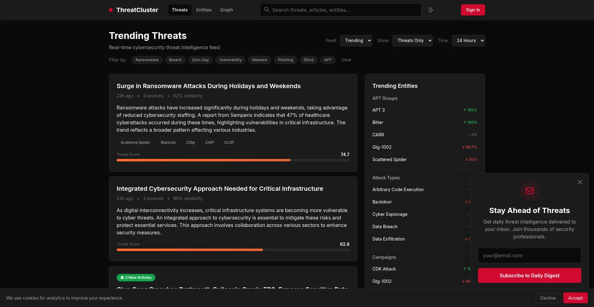 ThreatCluster aggregates cybersecurity threat intelligence from 1000+ sources, clustering related articles and extracting key threat actors, malware, and IOCs.