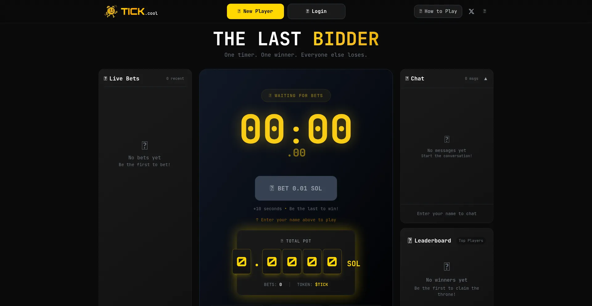 One timer. One winner. Everyone else loses. Place your bet to add time. Be the last bidder when the clock hits zero.
