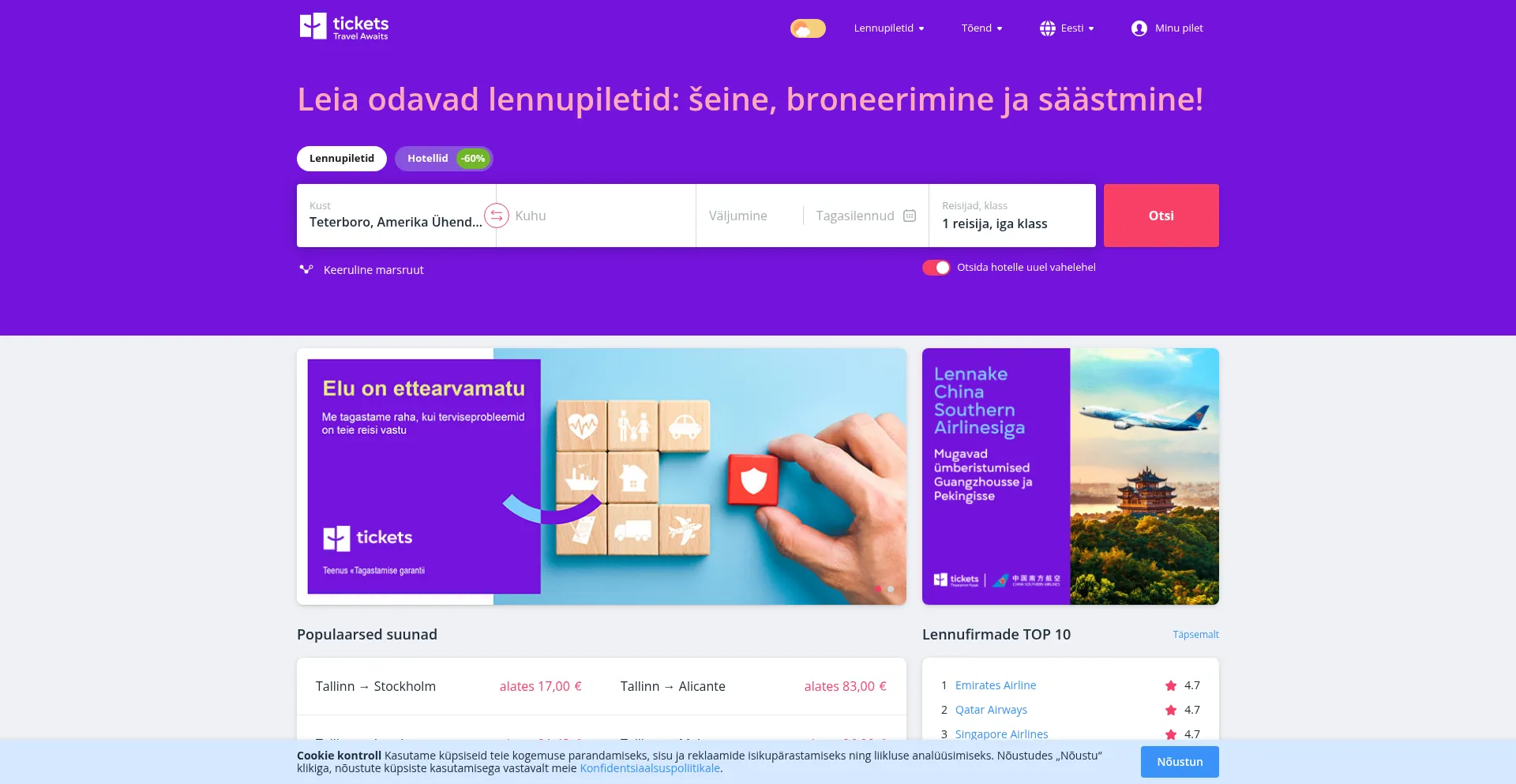 Mugav lennupiletite otsing. Võimalus osta pileteid igasse suunda, koostada ümberistumisega marsruut. Kõik lennufirmad, Eesti madalamad hinnad lennupiletitele lehel Tickets.ee.