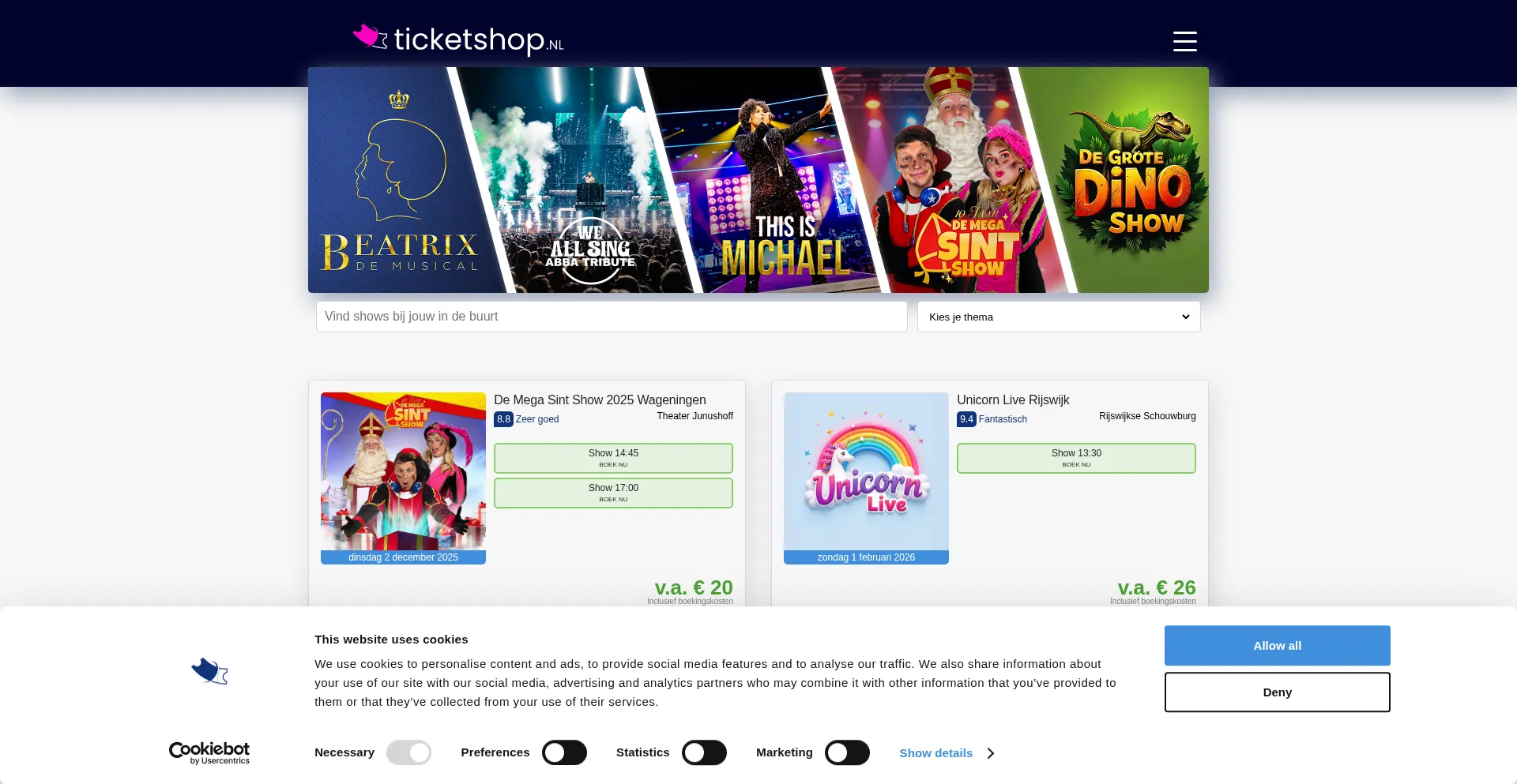 该网站实现符合GDPR或CCPA等隐私法规的cookie同意机制。这表明 ticketshop.nl 遵守数据保护标准并为用户提供对个人数据收集实践的控制。