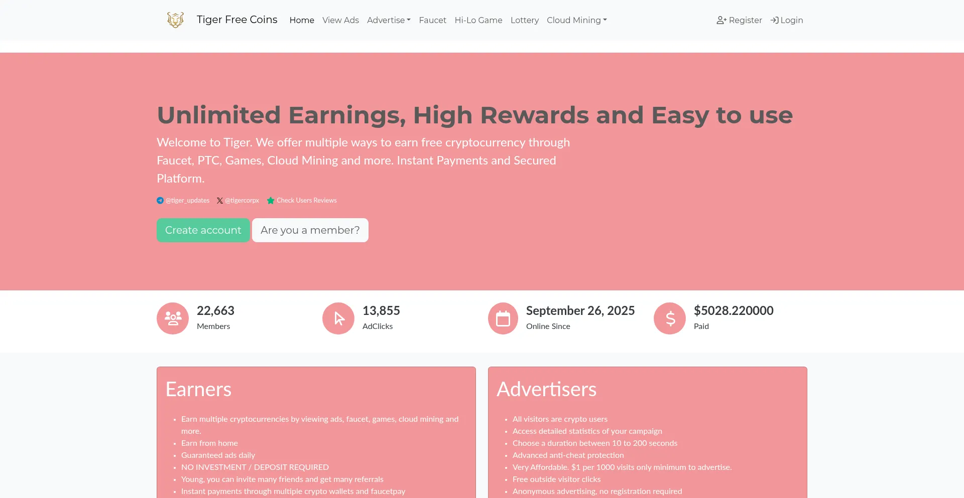Welcome to Tiger. We offer multiple ways to earn free cryptocurrency through Faucet, PTC, Games, Cloud Mining and more. Instant Payments and Secured Platform.