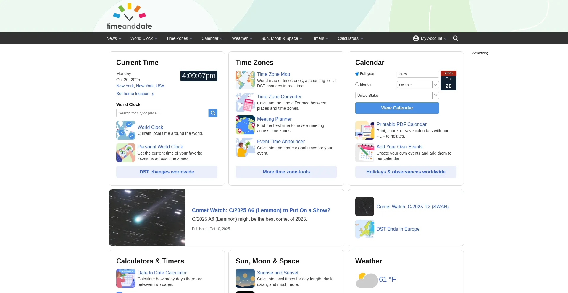 Welcome to the world's top site for time, time zones, and astronomy. Organize your life with free online info and tools you can rely on. No sign-up needed.