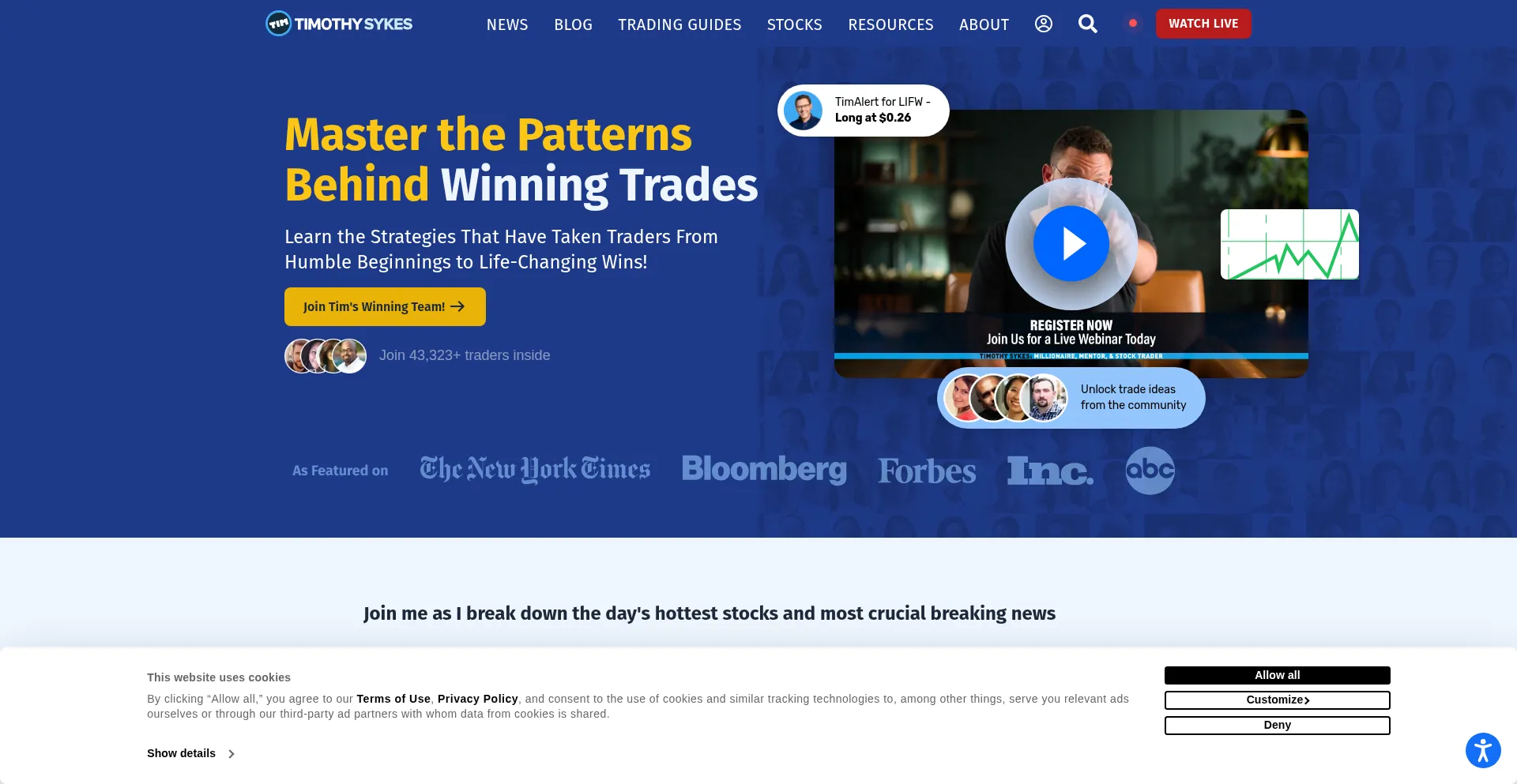 该网站实现符合GDPR或CCPA等隐私法规的cookie同意机制。这表明 timothysykes.com 遵守数据保护标准并为用户提供对个人数据收集实践的控制。