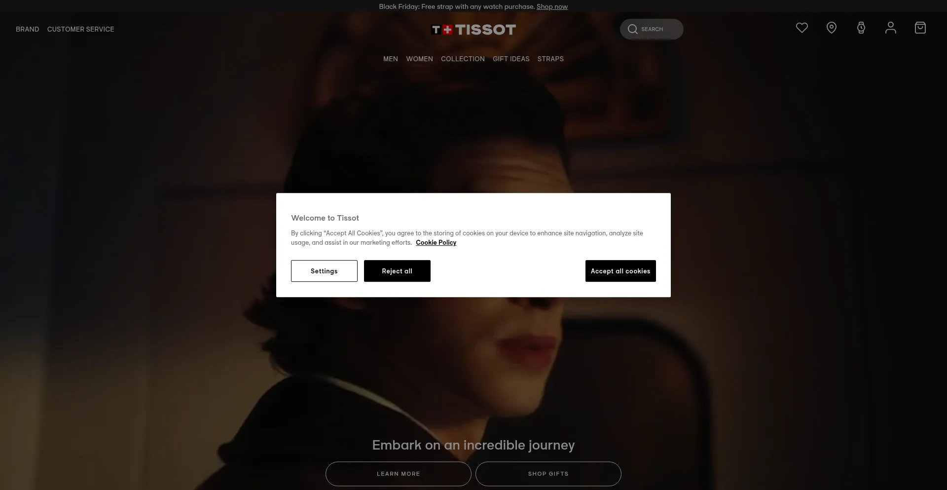 该网站实现符合GDPR或CCPA等隐私法规的cookie同意机制。这表明 tissotwatches.com 遵守数据保护标准并为用户提供对个人数据收集实践的控制。