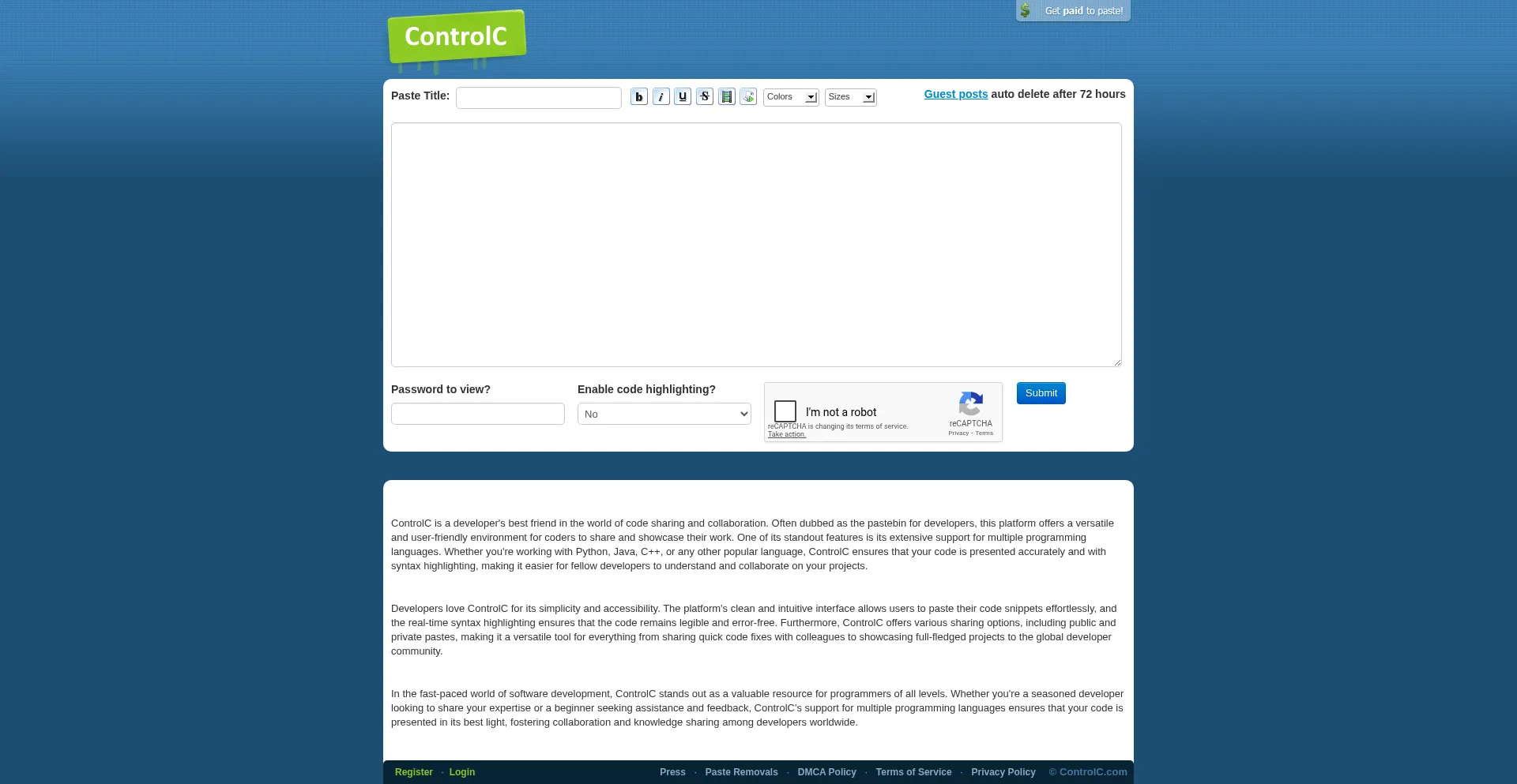 The ControlC pastebin is the original next generation tool for sharing text. We offer a full suite of tools and a affiliate program for users to make money. Formerly known as P...
