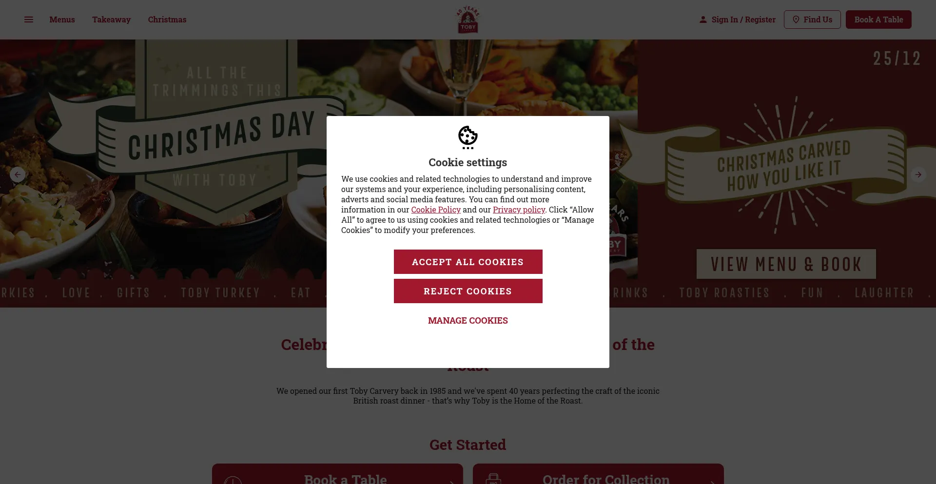 该网站实现符合GDPR或CCPA等隐私法规的cookie同意机制。这表明 tobycarvery.co.uk 遵守数据保护标准并为用户提供对个人数据收集实践的控制。
