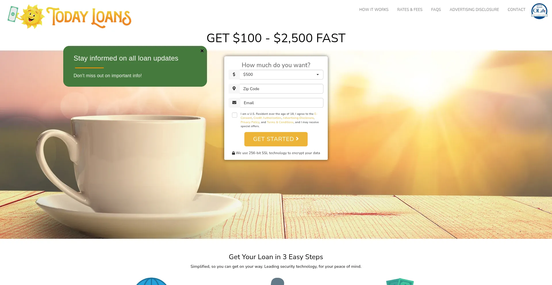 该网站实现数据收集表单,请求个人信息,包括姓名、电子邮件地址、电话号码或其他敏感详细信息。用户应验证 today-loans.com 的合法性并在提交个人数据前查看隐私政策。