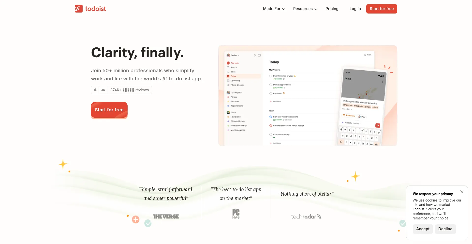 Trusted by 30 million people and teams. Todoist is the world's favorite task manager and to-do list app. Finally become focused, organized and calm.