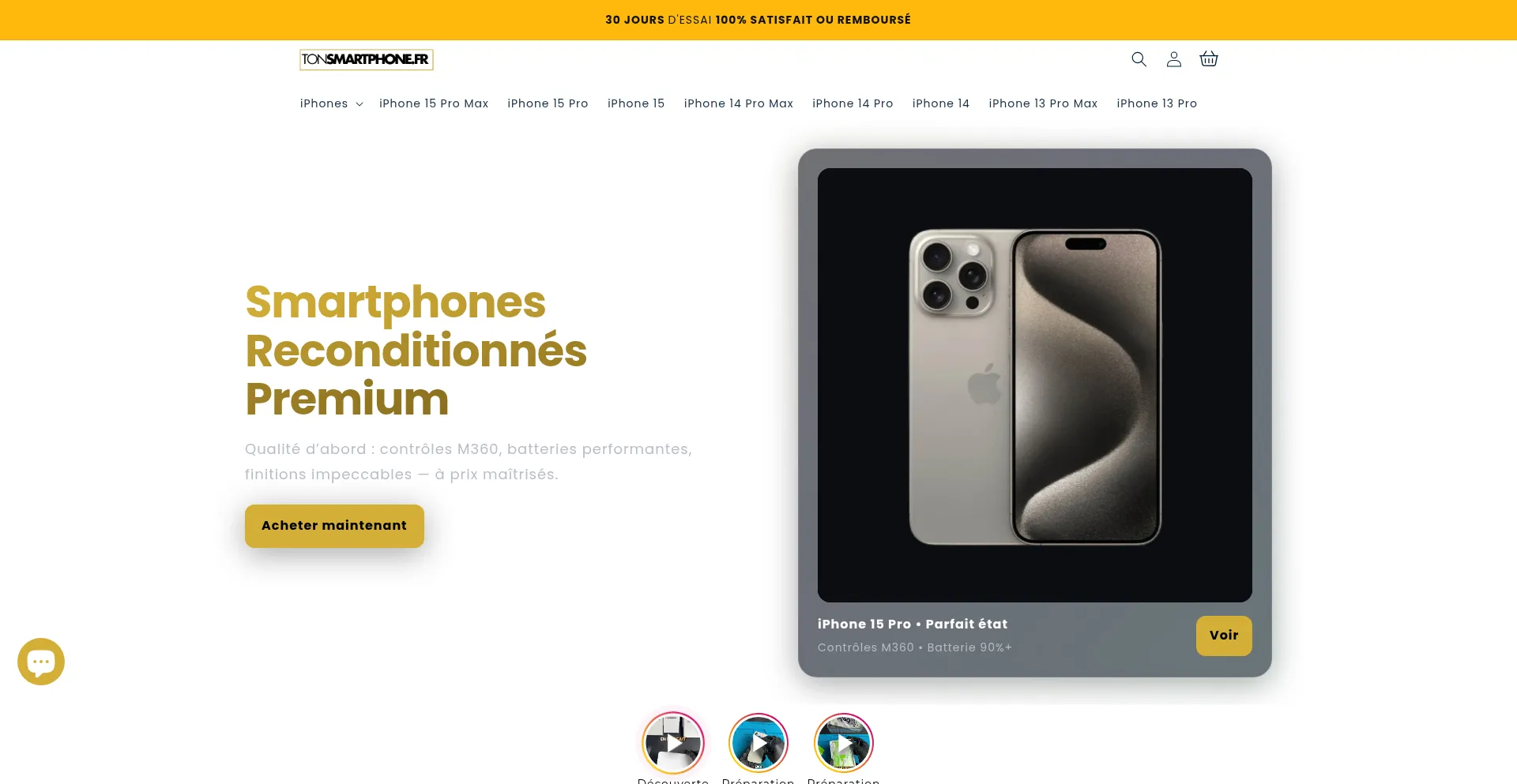 Trouvez l’iPhone reconditionné Premium qu'il vous faut chez Tonsmartphone.fr : contrôlés M360, batterie ≥ 90 %, état impeccable, garantie 24 mois.