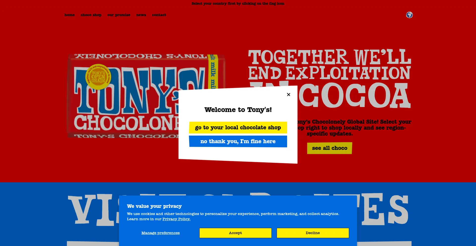 该网站实现符合GDPR或CCPA等隐私法规的cookie同意机制。这表明 tonyschocolonely.com 遵守数据保护标准并为用户提供对个人数据收集实践的控制。