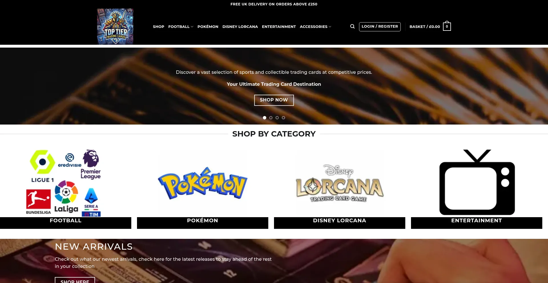 分析表明 toptiertradingcards.co.uk 作为电子商务平台运营,促进商品或服务的在线交易。该网站实现了购物车功能、支付处理系统和产品目录功能,这些是商业零售运营的典型特征。