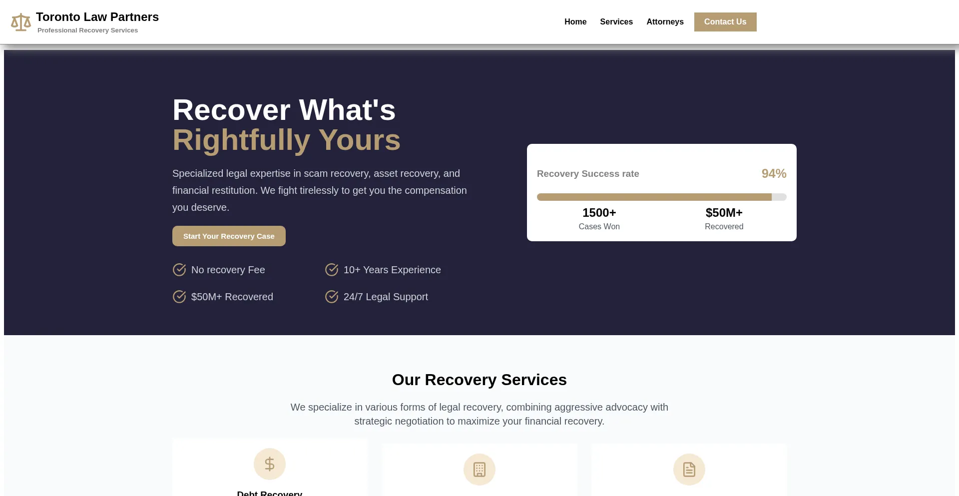 网站 torontolawpartners.ca 宣传针对丢失或被盗资产的资金恢复服务。虽然一些在应急费用结构上运营,其他可能需要预付款,这可能表明欺诈运营。在聘请此类服务前验证凭据和监管合规性。