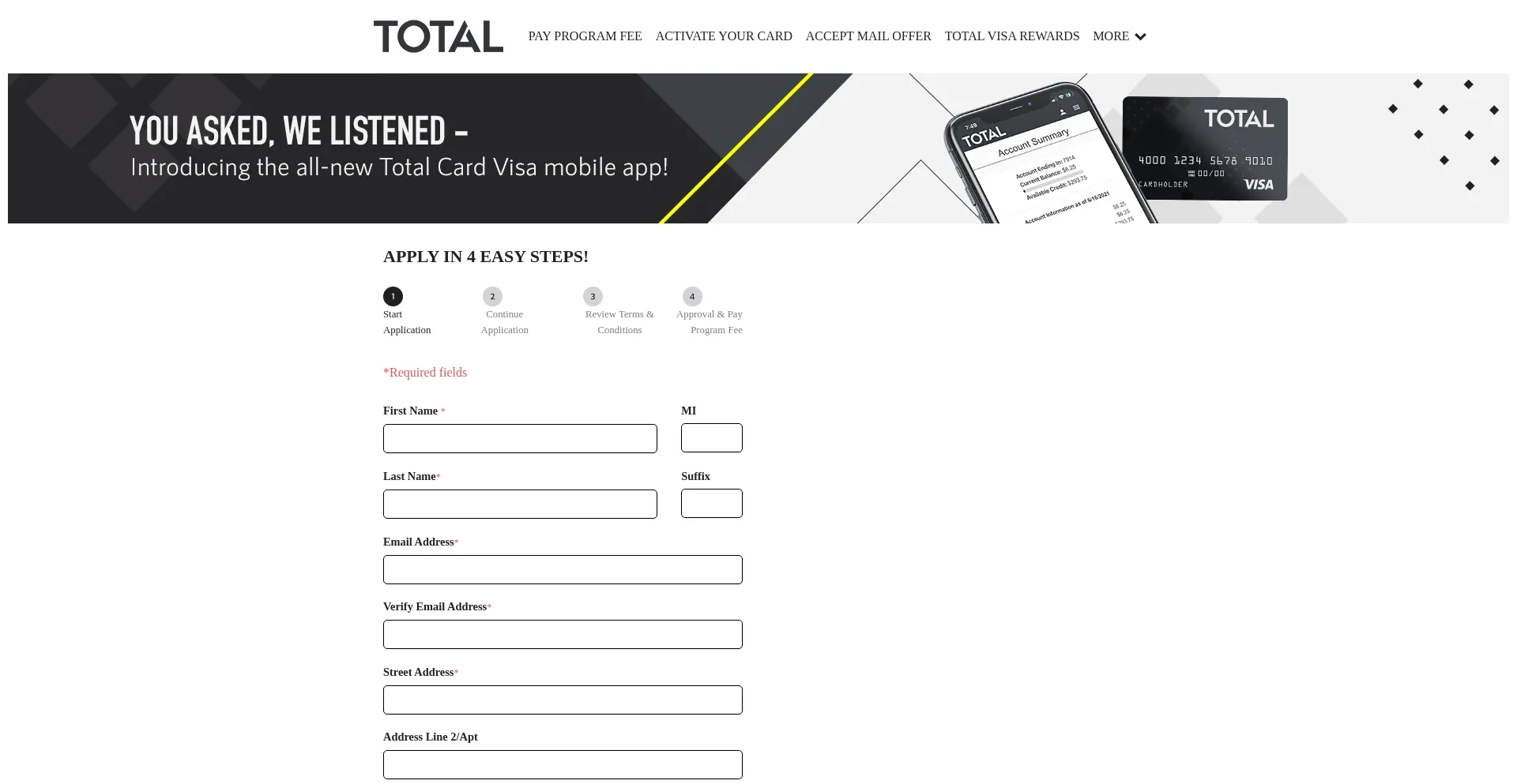 该网站实现数据收集表单,请求个人信息,包括姓名、电子邮件地址、电话号码或其他敏感详细信息。用户应验证 totalcardvisa.com 的合法性并在提交个人数据前查看隐私政策。