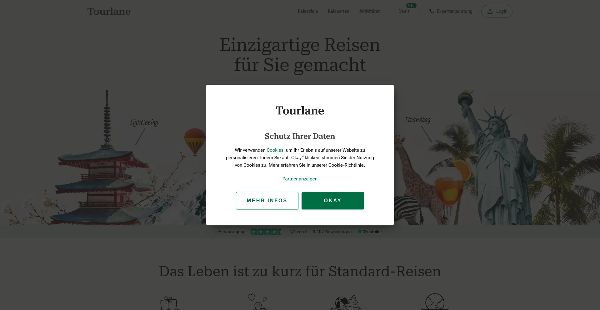 该网站实现符合GDPR或CCPA等隐私法规的cookie同意机制。这表明 tourlane.de 遵守数据保护标准并为用户提供对个人数据收集实践的控制。