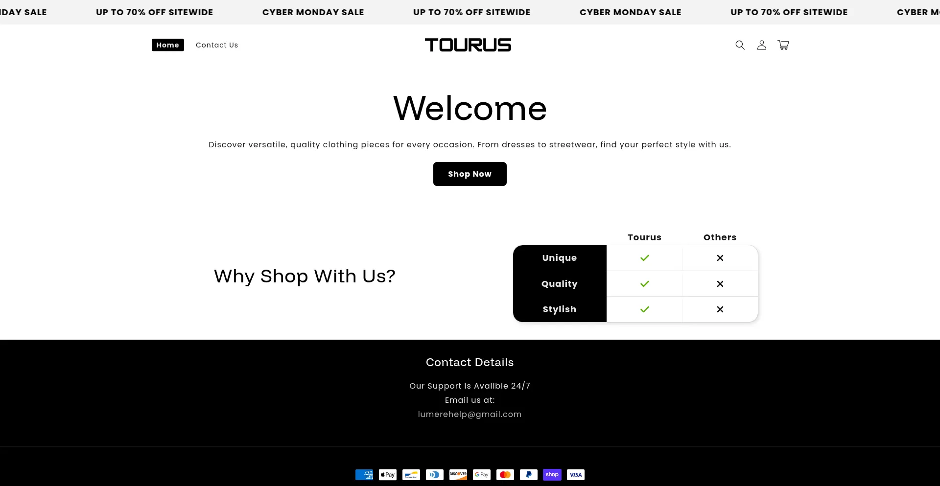 网站 touruscollection.myshopify.com 使用免费电子商务平台解决方案,这可能表明成本意识运营,但也可能暗示与企业级解决方案相比在安全功能、客户支持或高级功能方面的限制。