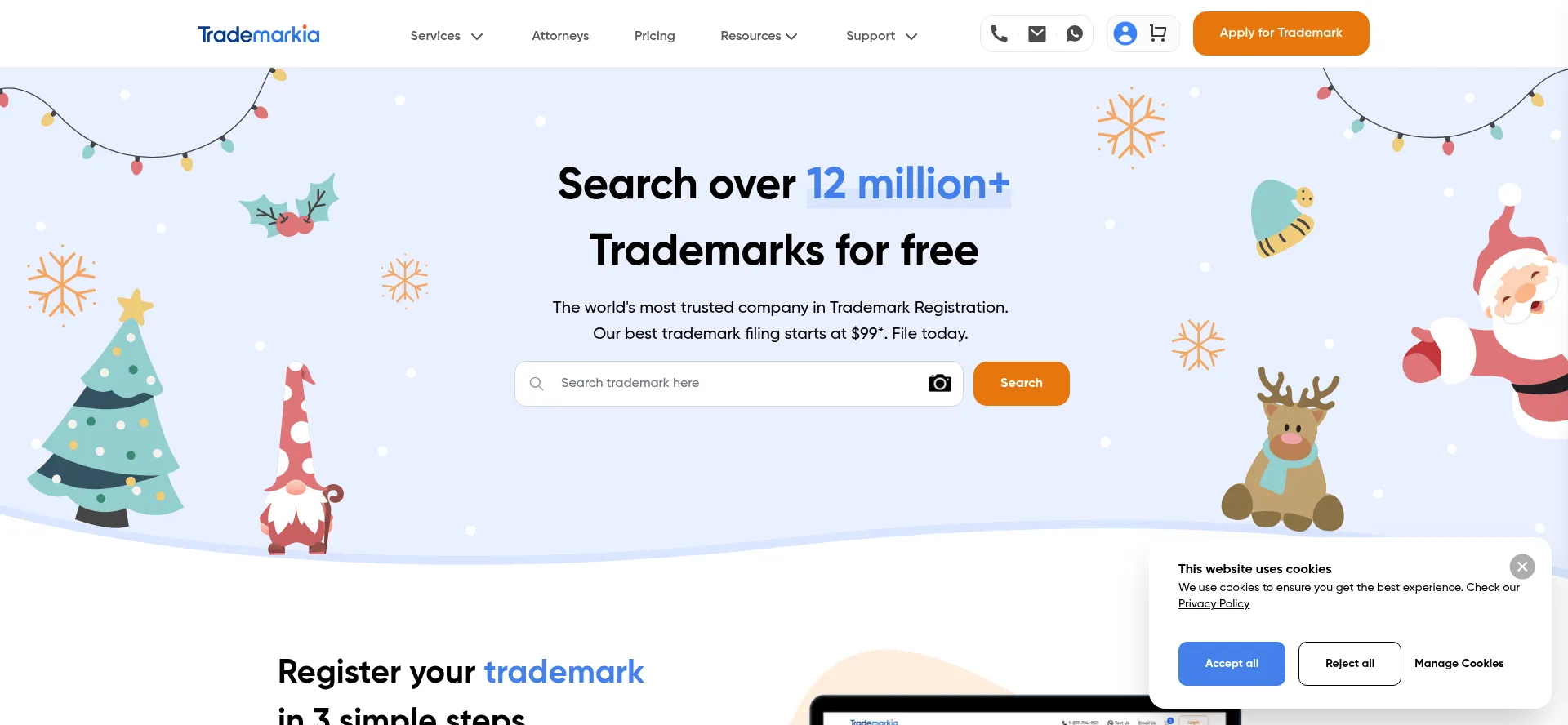 Trademarkia提供对USPTO注册商标的免费、快速和用户友好的搜索。它还允许用户通过商标注册在180多个国家保护他们的品牌。服务费用从99美元起。