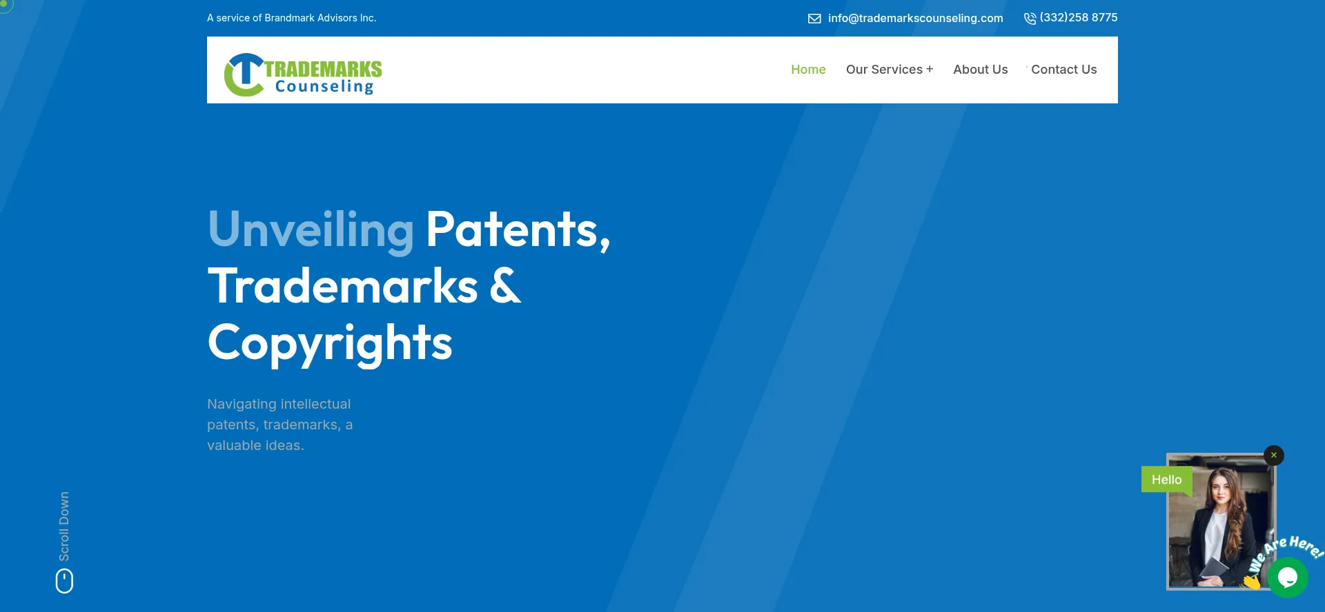 该网站实现数据收集表单,请求个人信息,包括姓名、电子邮件地址、电话号码或其他敏感详细信息。用户应验证 trademarkscounseling.com 的合法性并在提交个人数据前查看隐私政策。