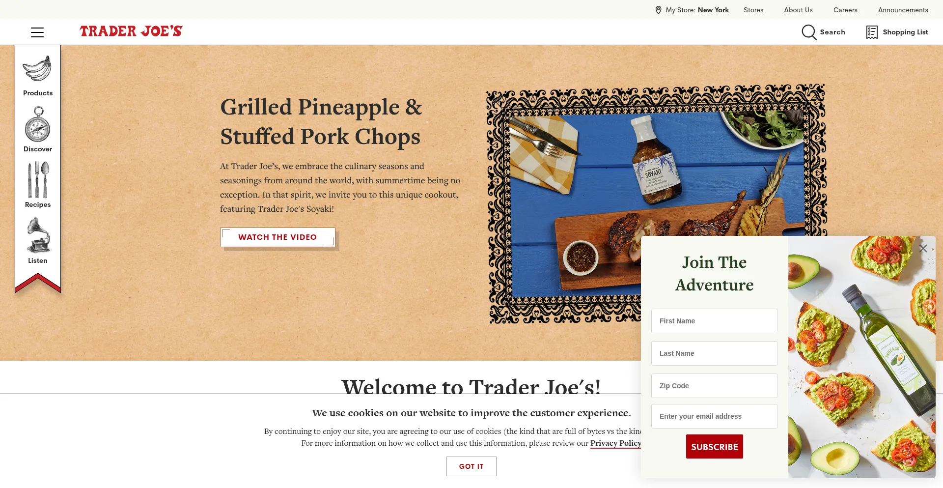 该网站实现符合GDPR或CCPA等隐私法规的cookie同意机制。这表明 traderjoes.com 遵守数据保护标准并为用户提供对个人数据收集实践的控制。