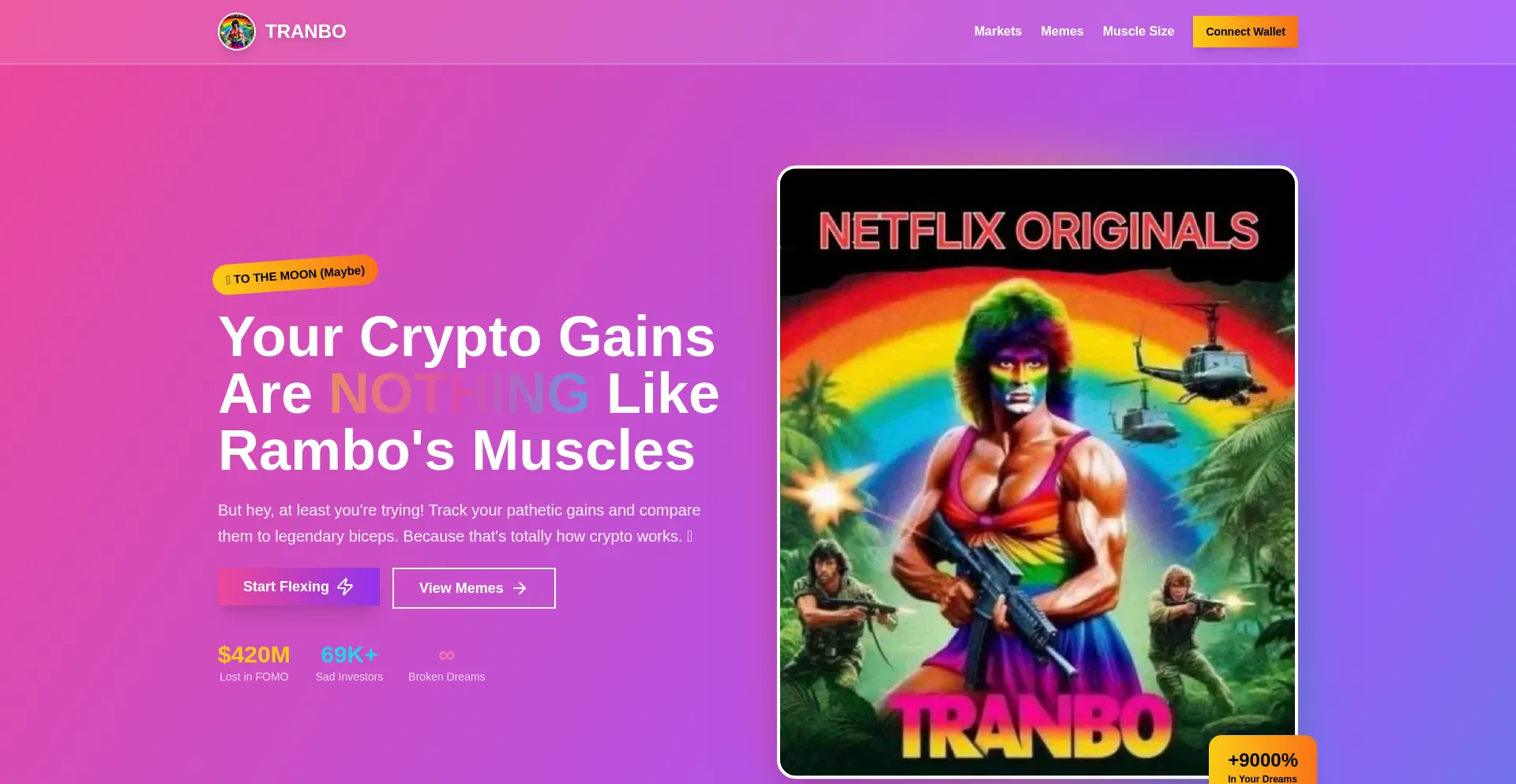 The most sarcastic crypto meme site on the internet. Compare your crypto gains to Rambo's muscle size because that's totally a normal thing to do.