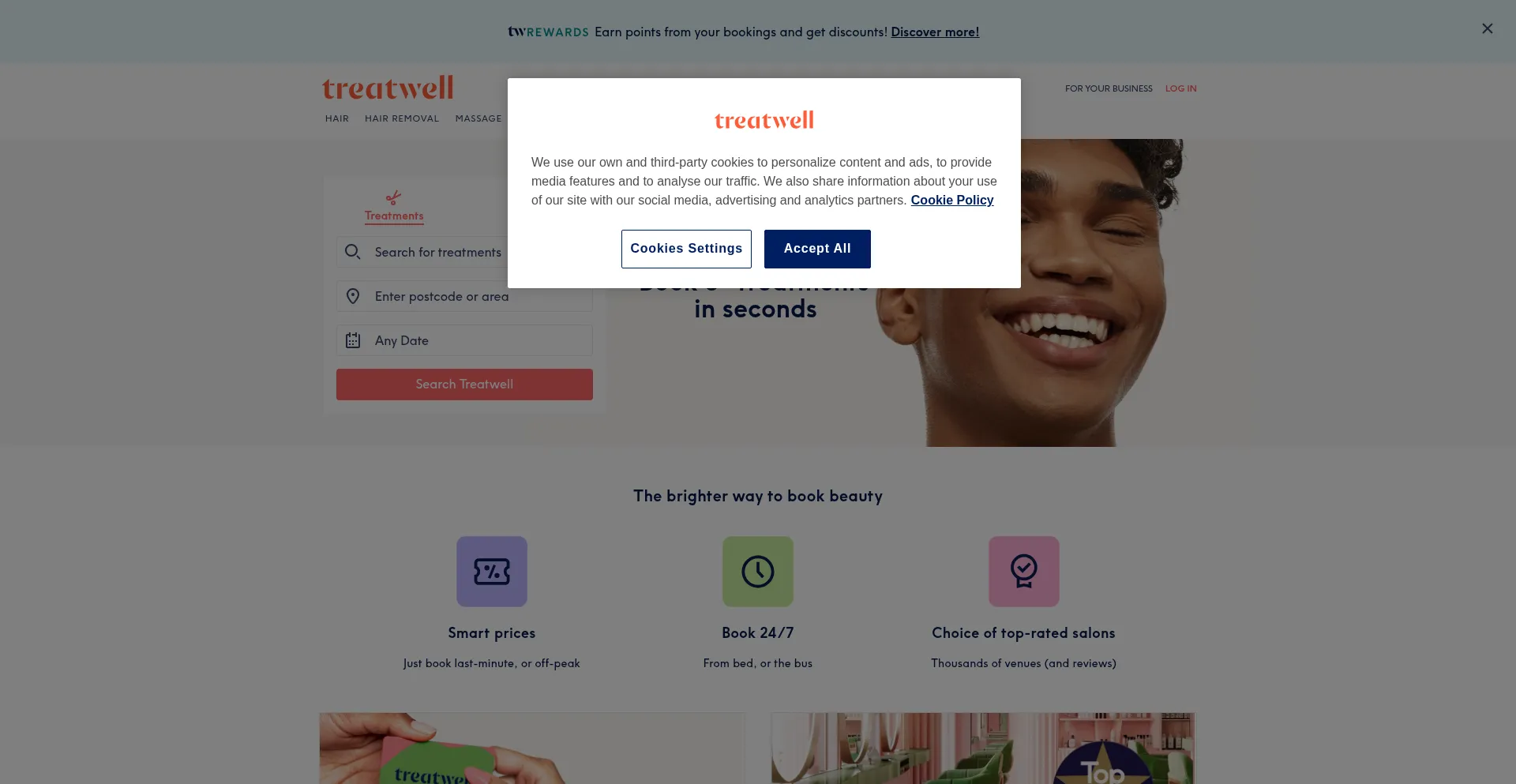 该网站实现符合GDPR或CCPA等隐私法规的cookie同意机制。这表明 treatwell.co.uk 遵守数据保护标准并为用户提供对个人数据收集实践的控制。