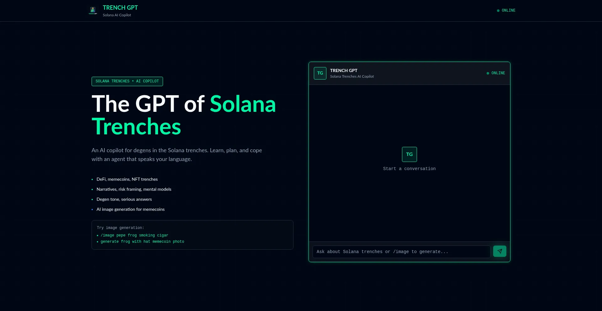 TRENCH GPT: An AI copilot for degens in the Solana trenches. Learn, plan, and cope with an agent that speaks your language.
