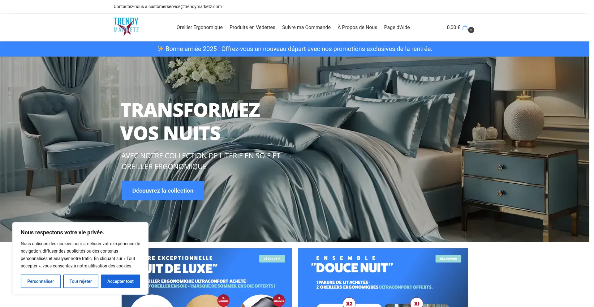 Découvrez Trendy Marketz, votre destination pour un sommeil de rêve. Oreillers ergonomiques, masques de nuit en soie, taies d’oreiller et parures de lit en soie de mûrier. ...