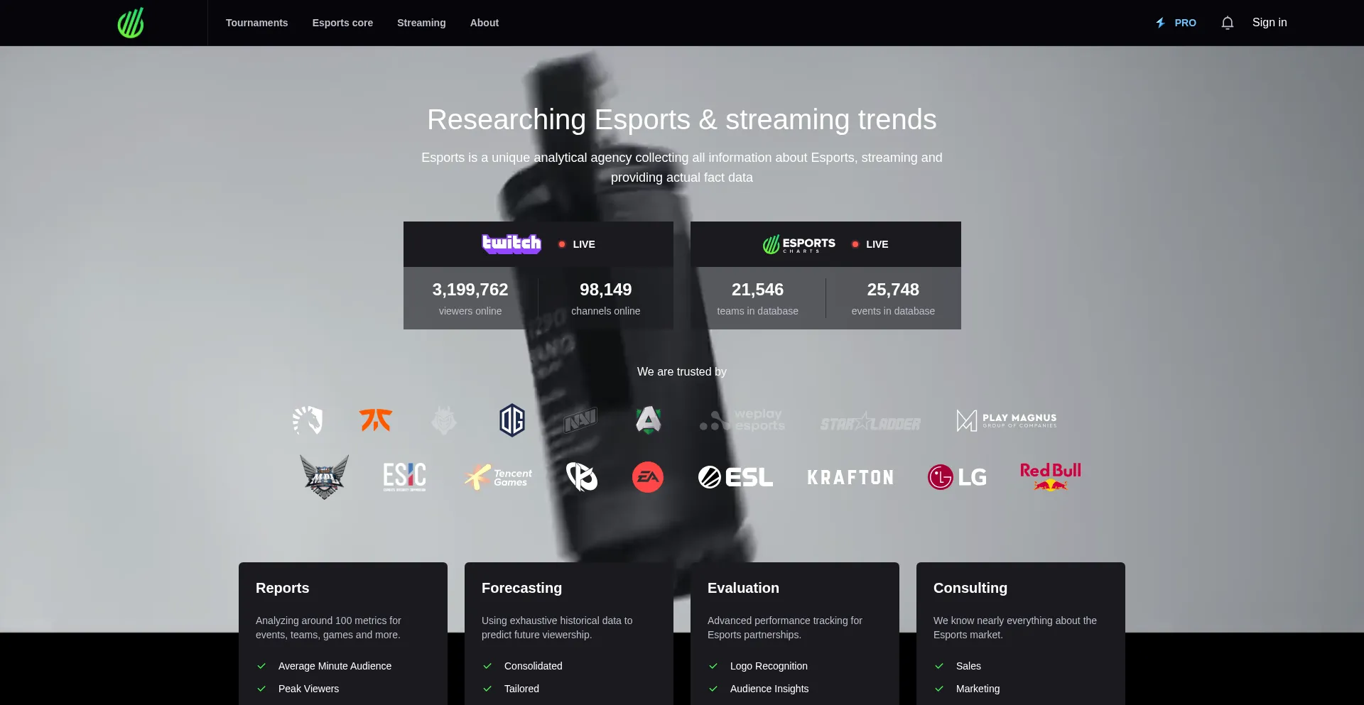 Esports is a unique analytical service that investigates trends of Esports development and streaming in general. Our service makes Esports more honest and clear, helps sponsors,...