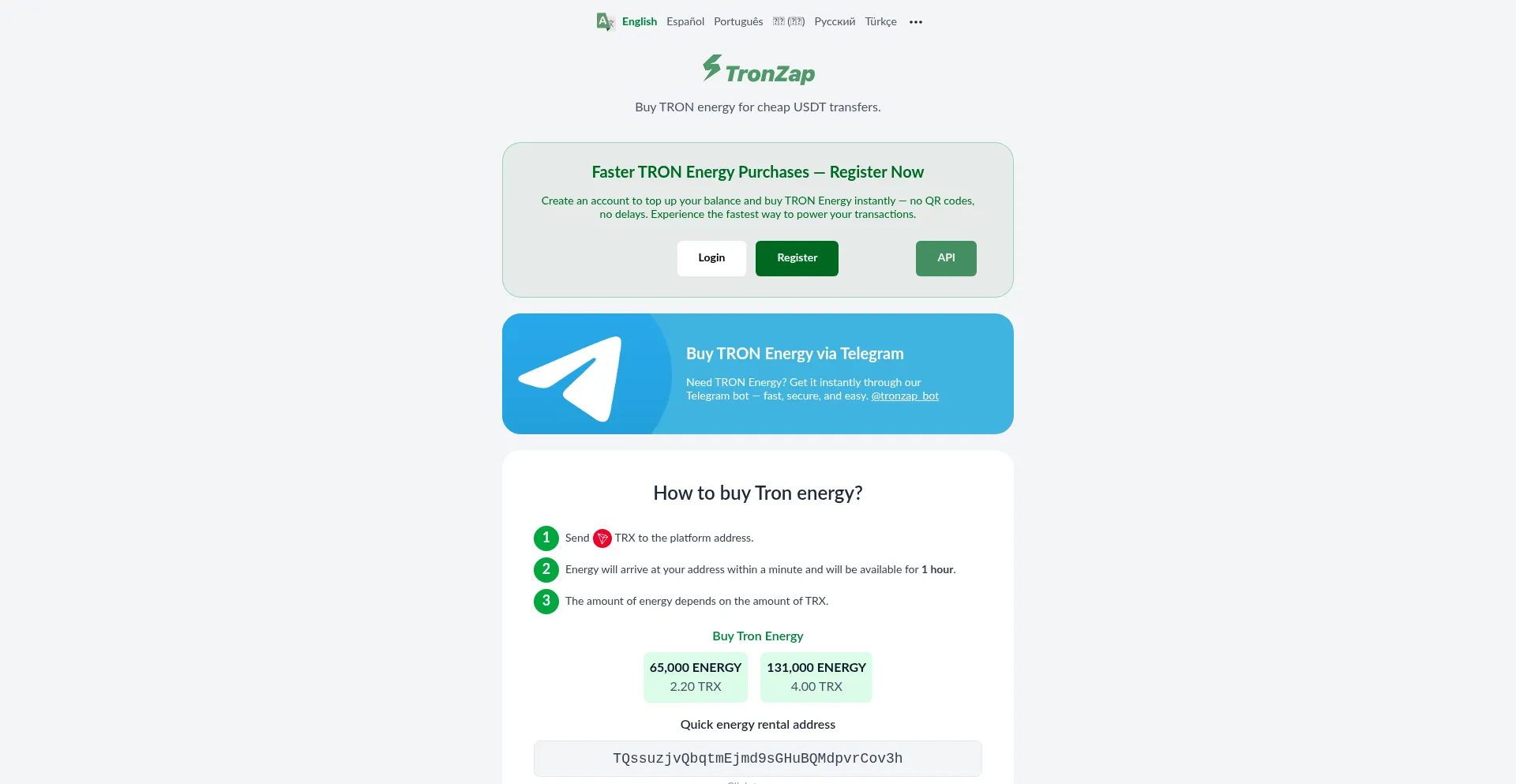 TronZap — Buy TRX energy to reduce USDT transfer fees on TRON network (TRC20) by up to 80% by renting Tron energy.