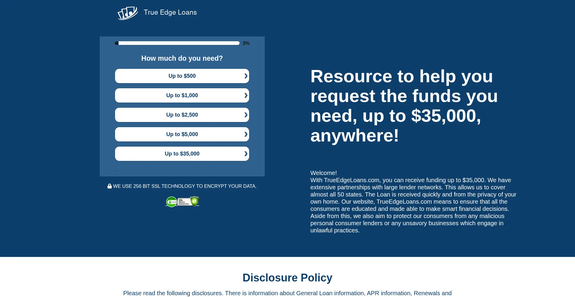 Trueedgeloans.com 是一个可疑网站,由于几个危险信号使其不可靠。该网站可能包含误导性信息,从事可疑做法,甚至可能托管恶意软件。同时很难确定谁真正运营该网站或如何联系他们。