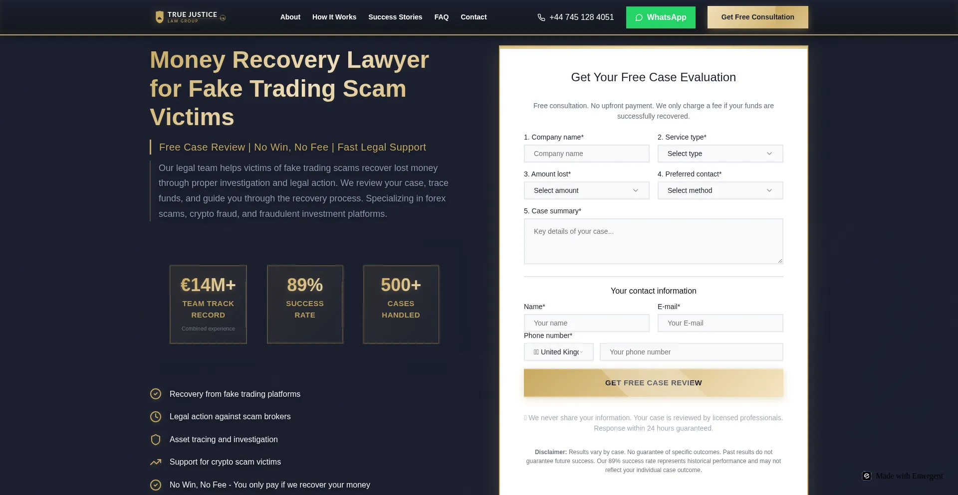 网站 truejusticelawgroup.com 宣传针对丢失或被盗资产的资金恢复服务。虽然一些在应急费用结构上运营,其他可能需要预付款,这可能表明欺诈运营。在聘请此类服务前验证凭据和监管合规性。