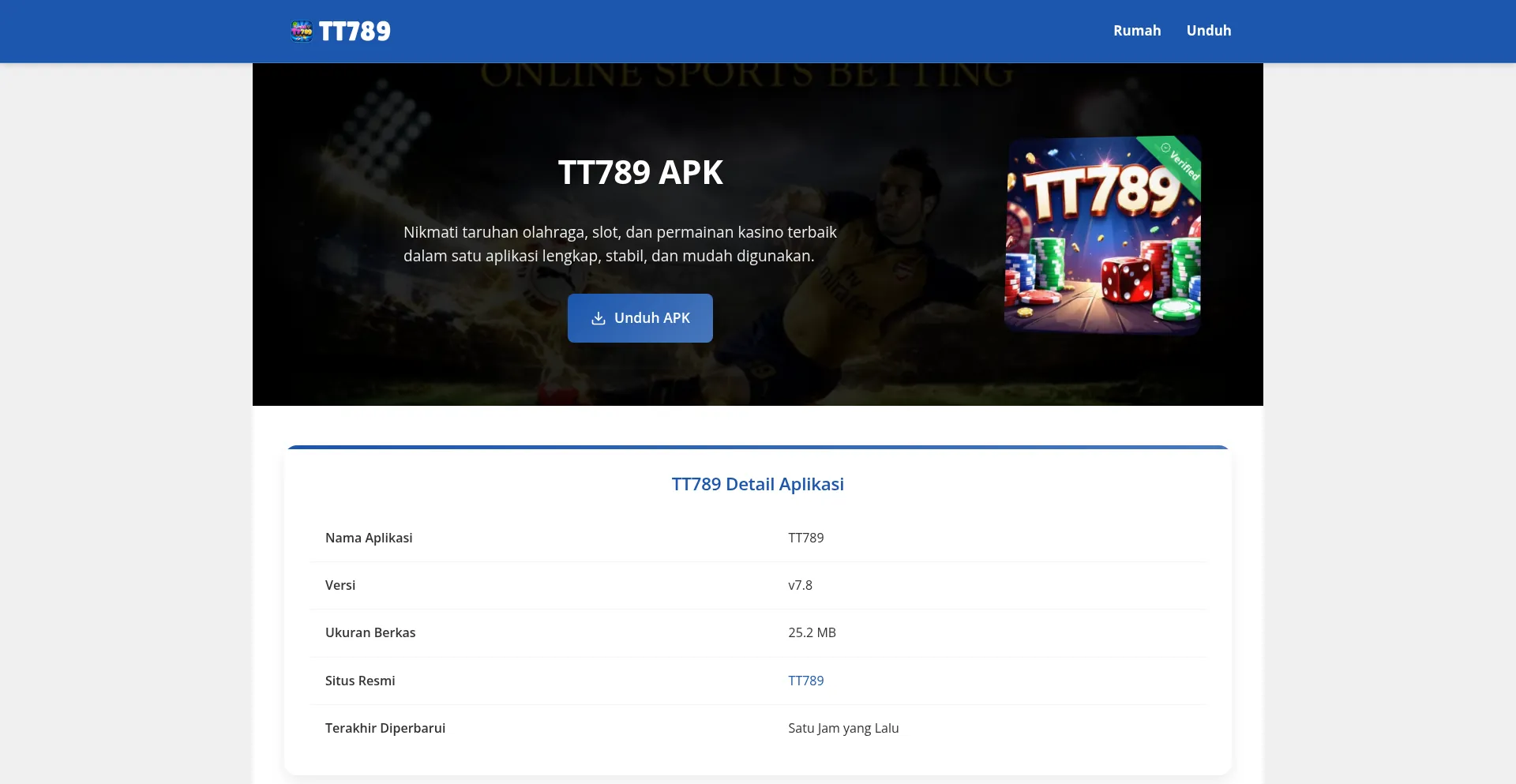 Unduh TT789 APK versi terbaru untuk pengalaman taruhan online terbaik di Indonesia. Mainkan sportsbook, kasino, dan slot langsung dari ponsel Anda.
